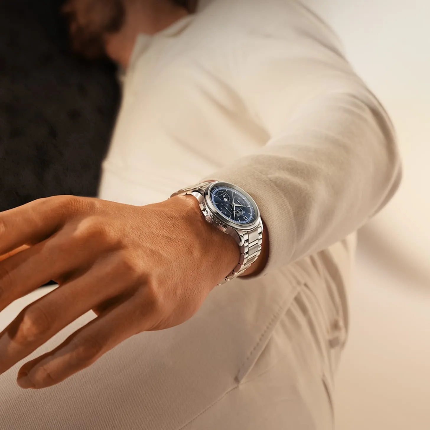 Measuring a well-balanced 40mm x 12.05mm, this stainless steel case has a smooth, polished bezel and broad pushers that complement the watch’s modern design. The combination of polished and brushed finishes on the case enhances its visual appeal, catching the light beautifully.
