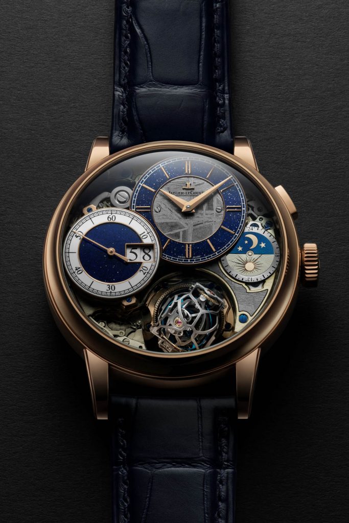 The dial side has changed a little since the Jubilee variant of 2013. That watch was to celebrate 180 years of the manufacture Jaeger-LeCoultre which was founded in 1833 and came with a smart white time dial and simple sub-seconds. On this one, it seems that Jaeger-LeCoultre has let their hair down a bit as the time dial now features an insert of the Gibeon meteorite which crashed into Namibia, wrapped up in a glittery aventurine ring. The seconds subdial features the same glittery ring but also a Grand Feu enamel centre instead of meteorite, for variety, probably. There’s a day/night indicator too which has been decorated impeccably with hand guilloché and gold.