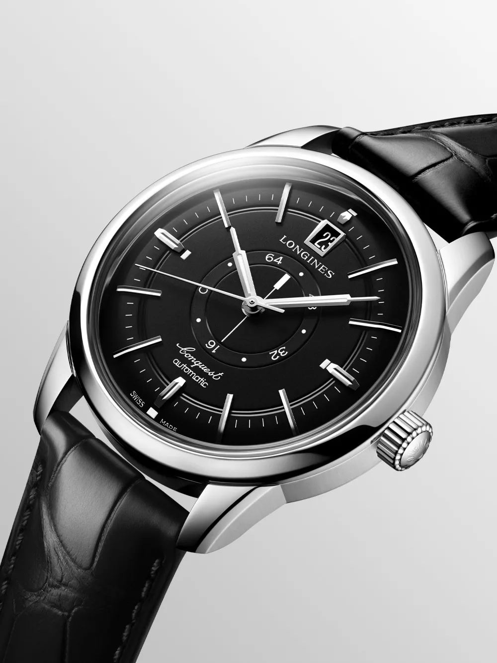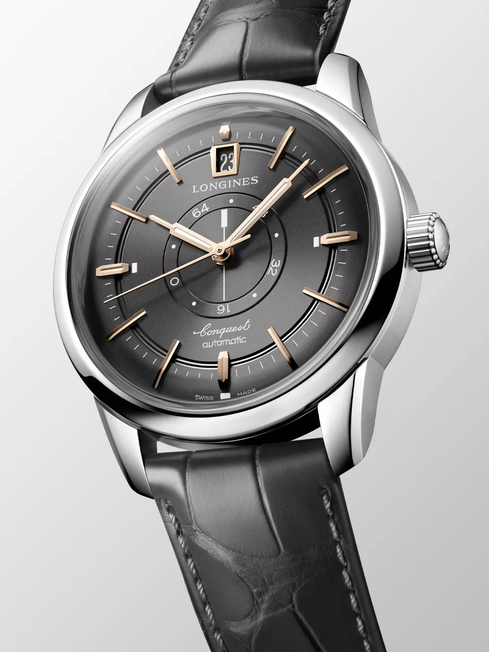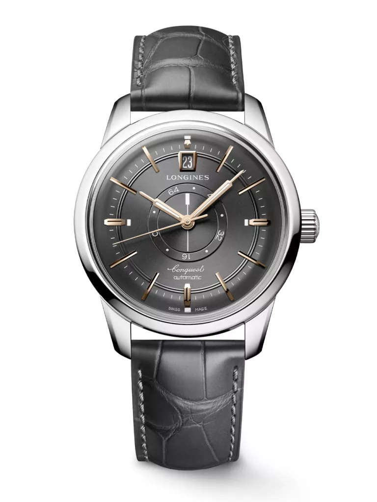 The dial of the Conquest Heritage Central Power Reserve is available in champagne, anthracite, or black. The three-part dial is adorned with applied facetted hour markers in yellow gold, rose gold, or silver colors.
