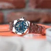 The dial is a flat silver colour with deep black ‘dolphin’ styled Arabic numerals contrasting nicely. The blue steel leaf-shaped hands stand out well, too, and make for easy legibility. The watch features a 30-minute chronograph and a running seconds subdial. The dial is covered by a domed sapphire crystal which distorts the numerals depending on the viewing angle too, which makes for an appealing effect.
