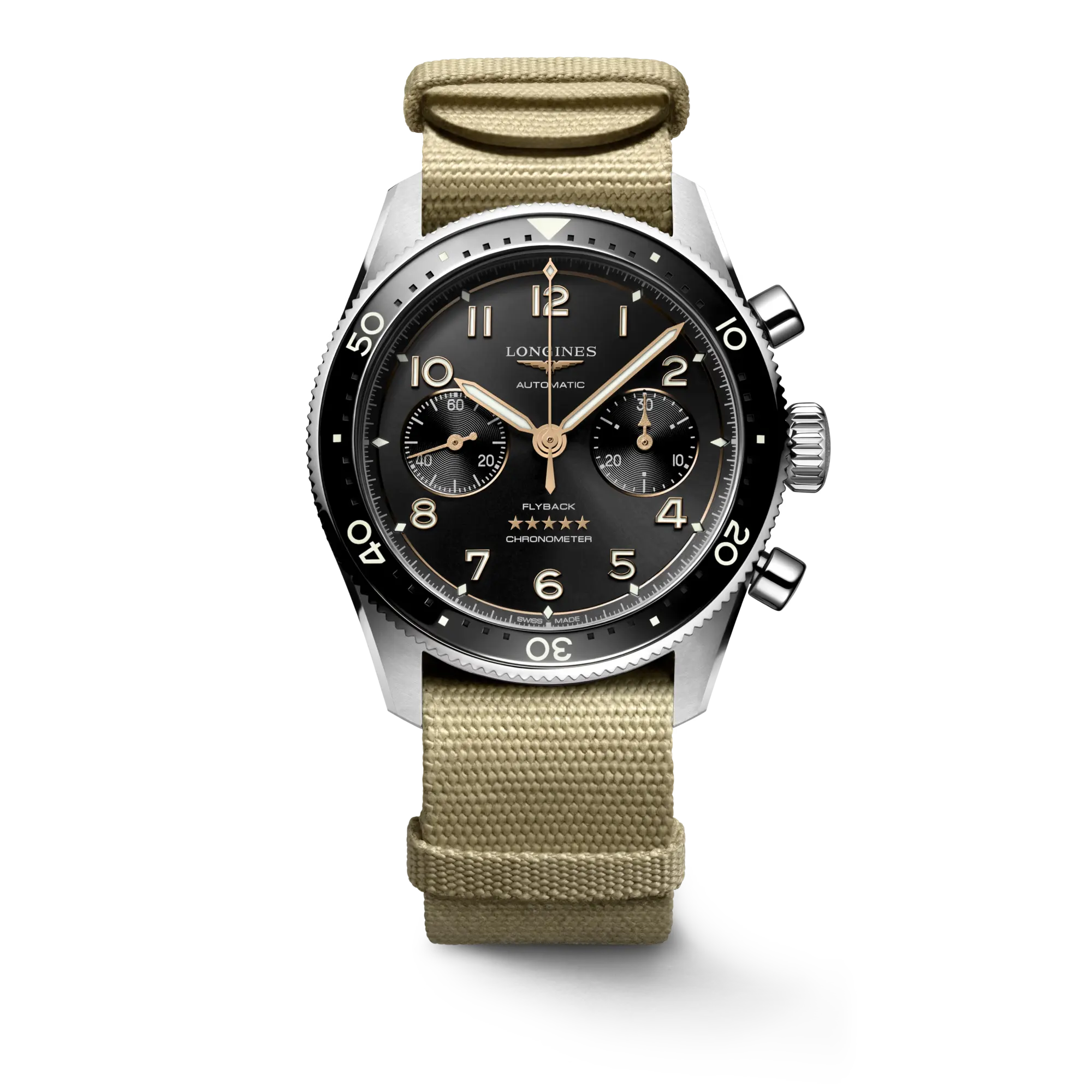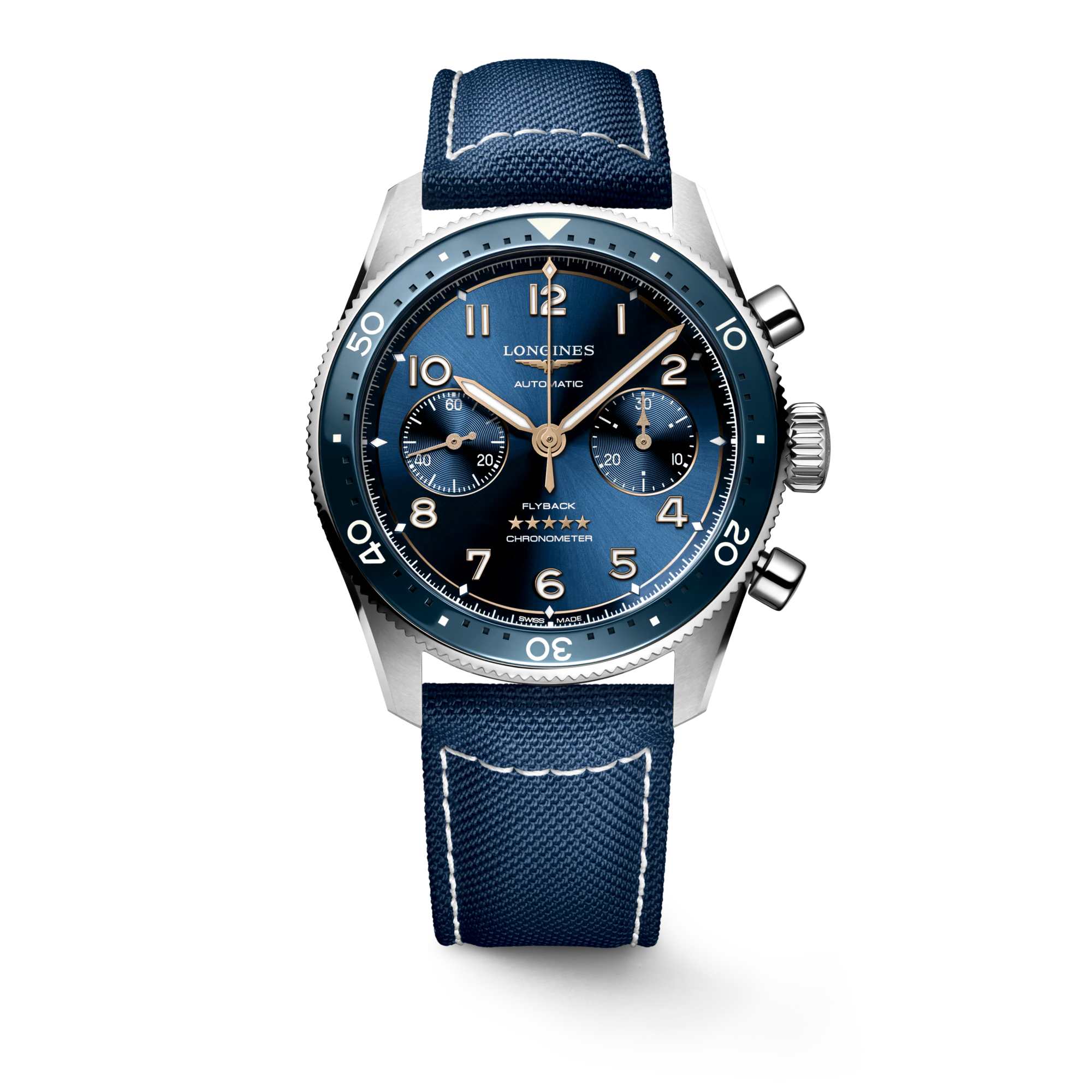 The Longines Spirit Flyback watch has interchangeable strap options, including brown leather and blue fabric. A steel bracelet is also an option. With an interchangeable system built into the straps and bracelet, switching between options is simple. For maximum comfort and a perfect fit, the straps have a folding clasp equipped with a new micro-adjustment system. Additionally offered is a beige NATO strap. The new references are priced at EUR 4,840/USD 4,450 on straps (leather, fabric, or NATO) or EUR 5,000/USD 4,550 on a steel bracelet.