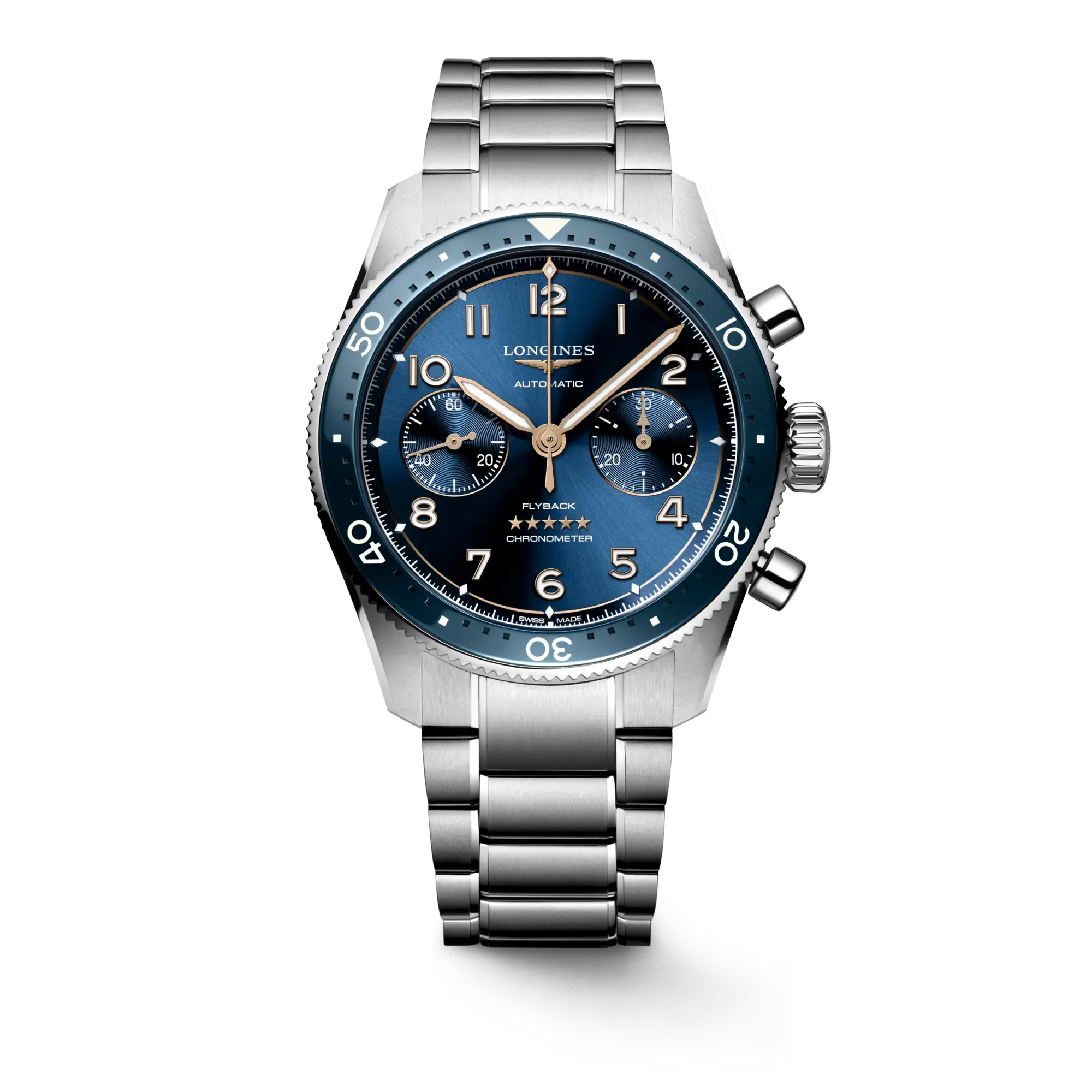 The Longines Spirit Flyback has a robust stainless steel construction with a sizing of 42 mm x 17 mm. It features a bi-directional bezel with a colored ceramic insert and luminescent markers, which can be used to keep track of elapsed time. The watch is water-resistant up to 10 ATM or approximately 100 meters and is protected by a sapphire crystal with an anti-reflective coating on both sides. The transparent case back allows the wearer to admire the intricate inner workings of the timepiece.
