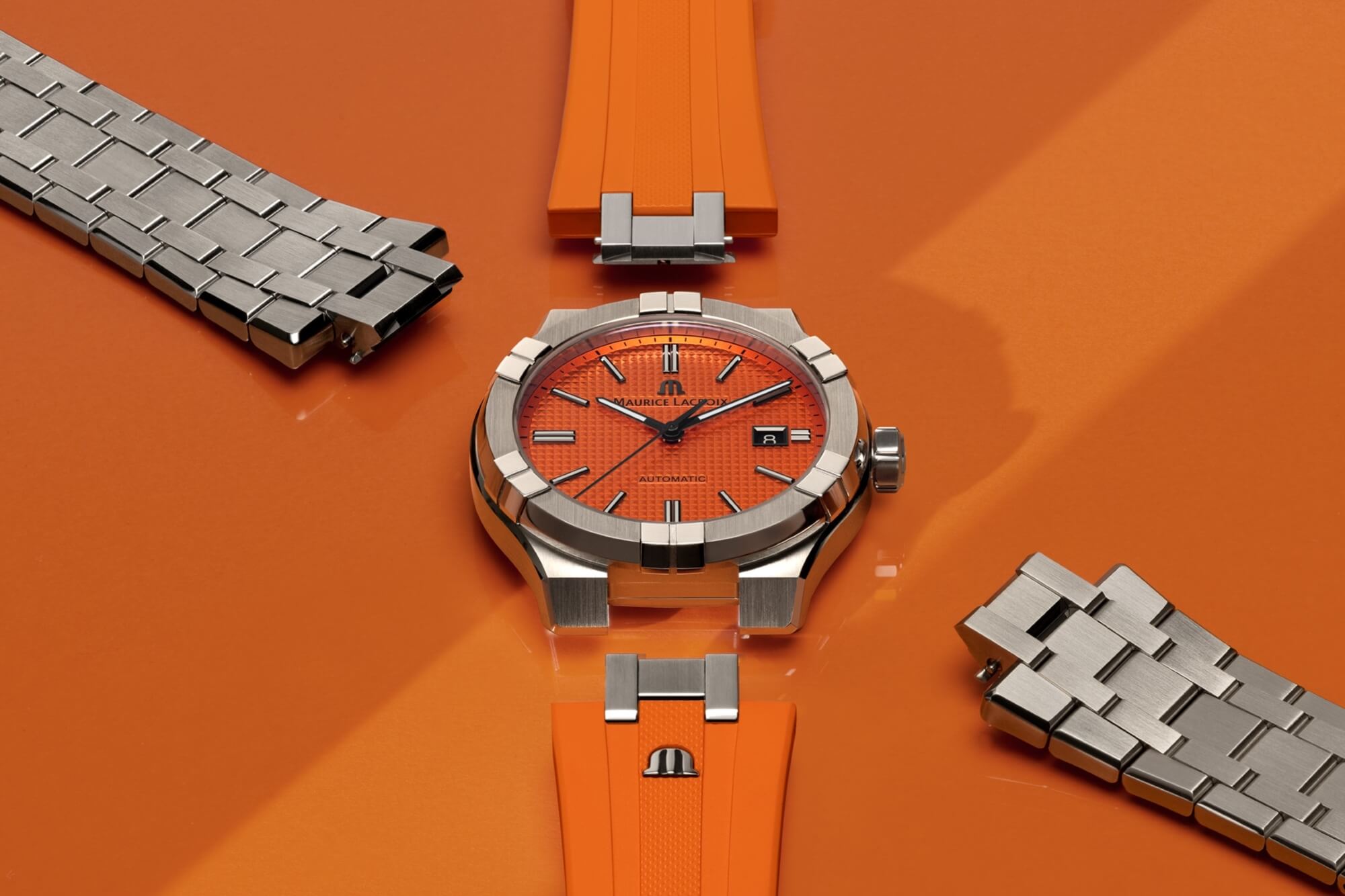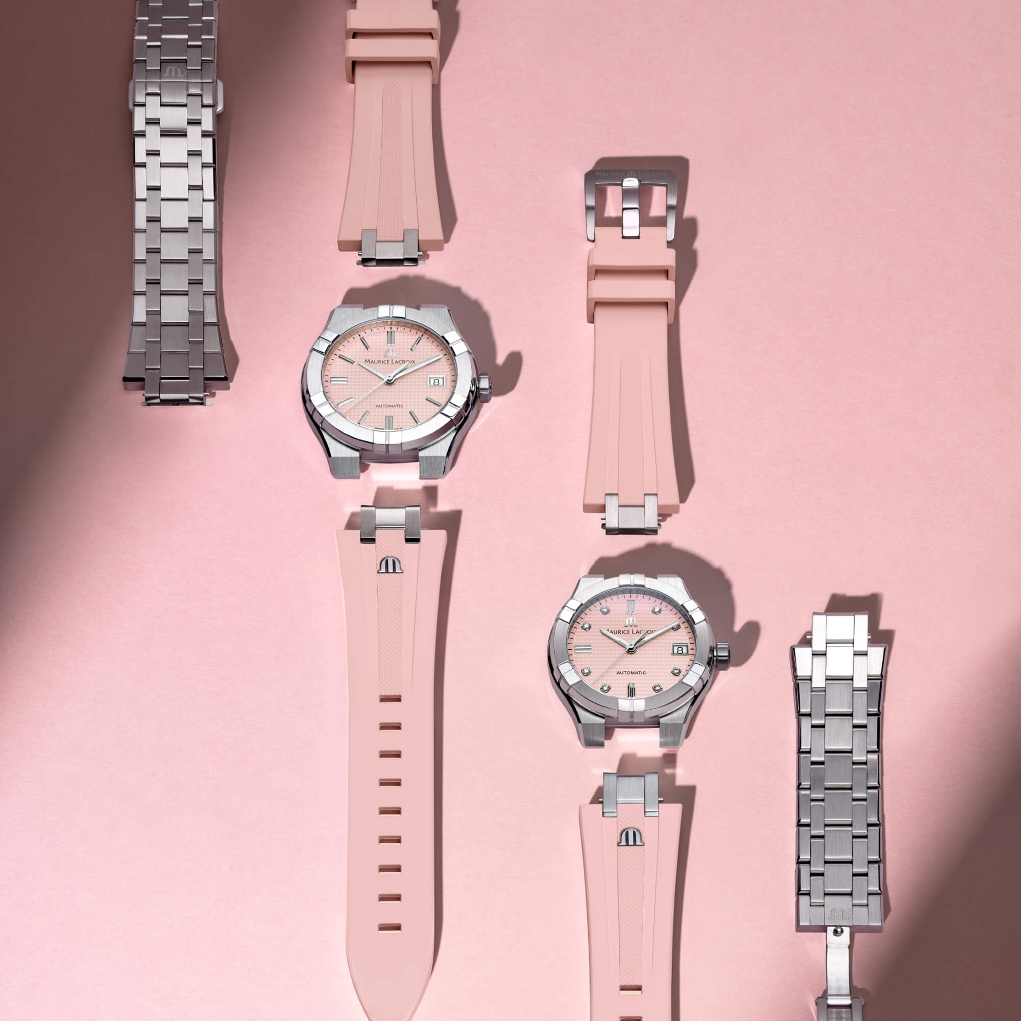 The dial of each Maurice Lacroix Aikon Summer Edition watch features a captivating Clous de Paris pattern in vibrant shades of pink, turquoise, and orange. Applied silver-colored markers and hands, complemented by Super-LumiNova for enhanced legibility, grace the dials.