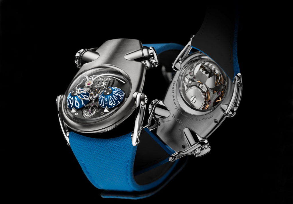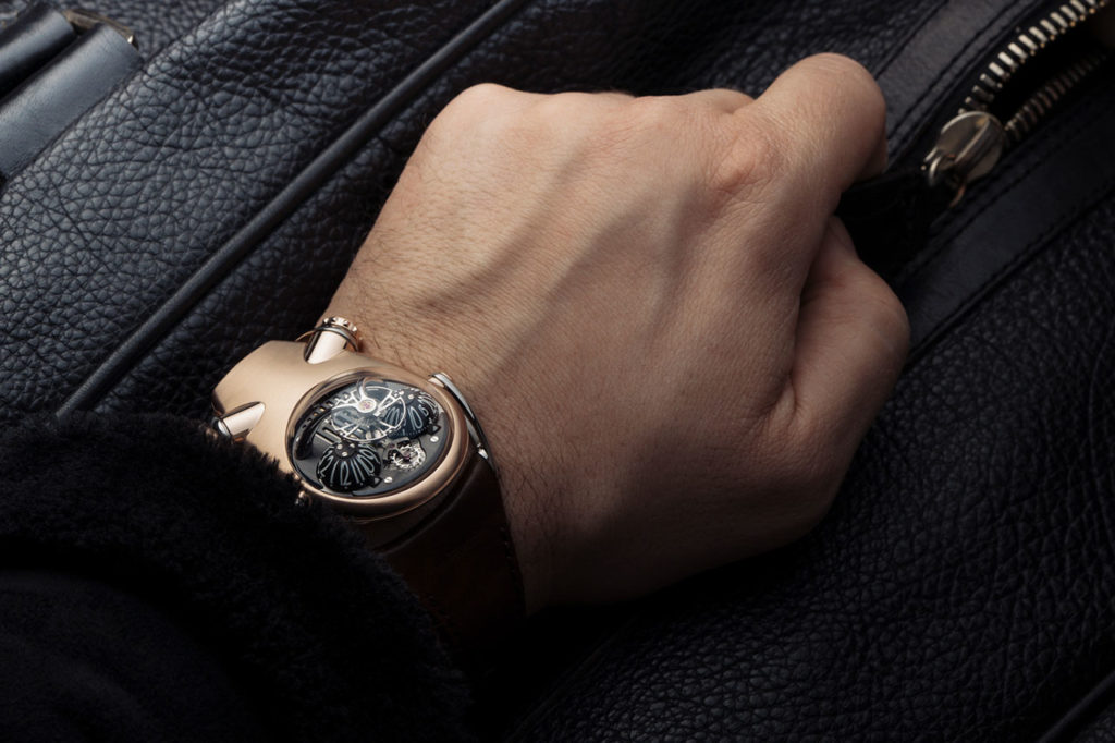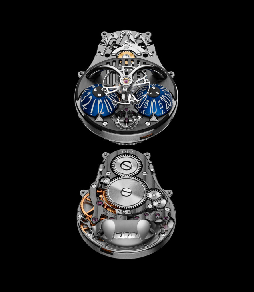 The time on this watch is told in a signature way for MB&F, using two hemispheres with elongated numbers on them that turn slowly. In this case, they are also representing the eyes of the bulldog, and the lugs which look chunky are meant to be the legs. It’s sort of an odd appearance and one that’s a little tricky to visualise. Luckily, visible through the sapphire underside is a set of teeth which look ready to have a good old go at your wrist at any time. But it wouldn’t do that. It’s not styled after a cat.