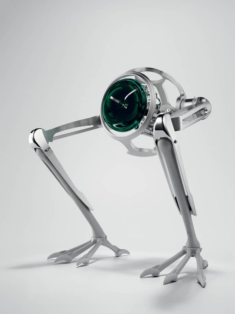 While it is functionally meant to display the time, where the MB&F T-REX really shines is its design. Modeled around the skeleton of a T-REX, the long legs with sharp angular clawed feet on this horological masterpiece mimic the mighty limbs of the ferocious creature and give it a bold and aggressive stance. Centrally mounted on top is a skeletonized housing that comprises the brain and the face of the watch. Made using age-old glass blowing techniques the dial on this clock is made from Murano glass and resembles a big eyeball with two steel hands at the center to read the hours and the minutes.
