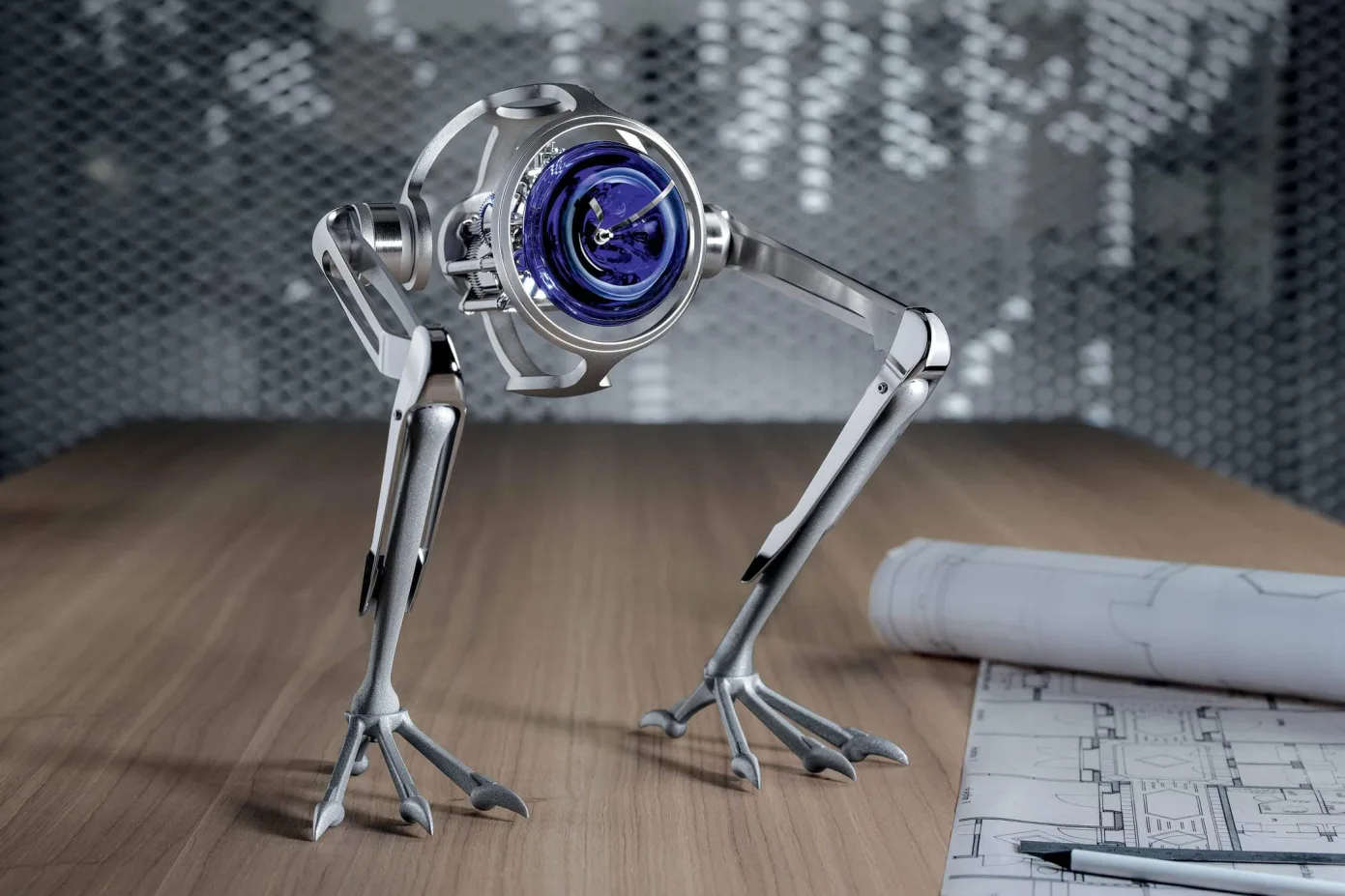 While it is functionally meant to display the time, where the MB&F T-REX really shines is its design. Modeled around the skeleton of a T-REX, the long legs with sharp angular clawed feet on this horological masterpiece mimic the mighty limbs of the ferocious creature and give it a bold and aggressive stance. Centrally mounted on top is a skeletonized housing that comprises the brain and the face of the watch. Made using age-old glass blowing techniques the dial on this clock is made from Murano glass and resembles a big eyeball with two steel hands at the center to read the hours and the minutes.