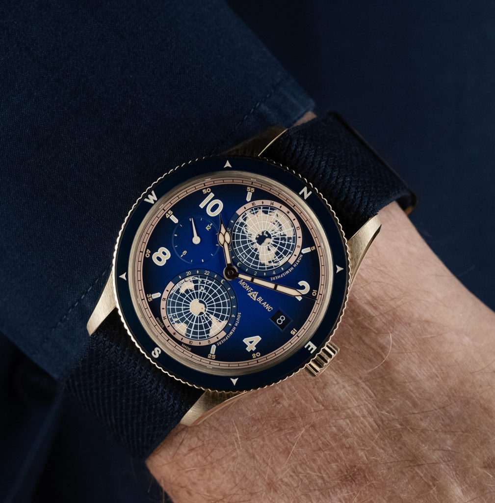 Inside the 42mm x 12.8mm bronze case is the calibre MB 29.25, which is based on a Sellita SW300-1. It has a 4Hz beat rate, a power reserve of 42 hours and Montblanc’s unique world time module added to it. It also has a date feature which has been put at 3 O’clock on the dial to balance it marginally.