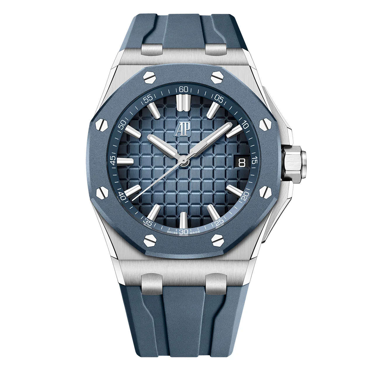 Moving to the dial, the new generation Mega Tapisserie pattern takes center stage. This textured motif, in a smoked blue hue, adds depth and a dash of playfulness. Housing the timekeeping essentials; hours, minutes, seconds, and date. The dial features rhodium-toned gold hour markers and luminescent Royal Oak hands for low-light visibility.