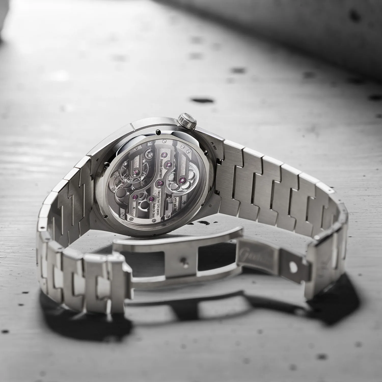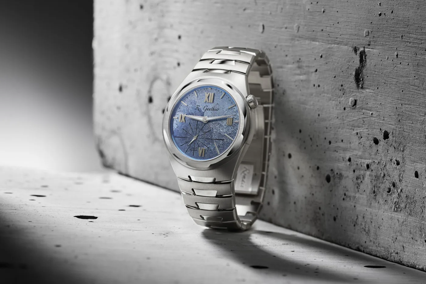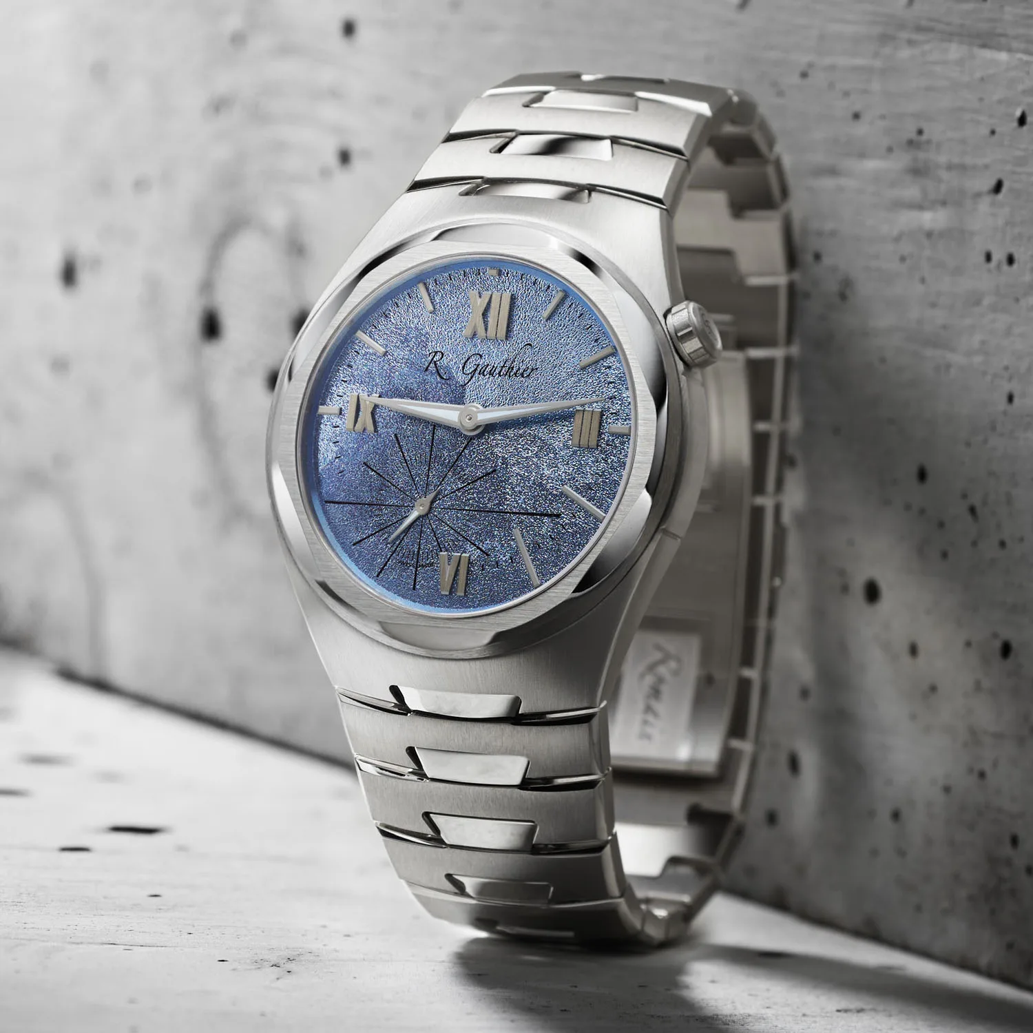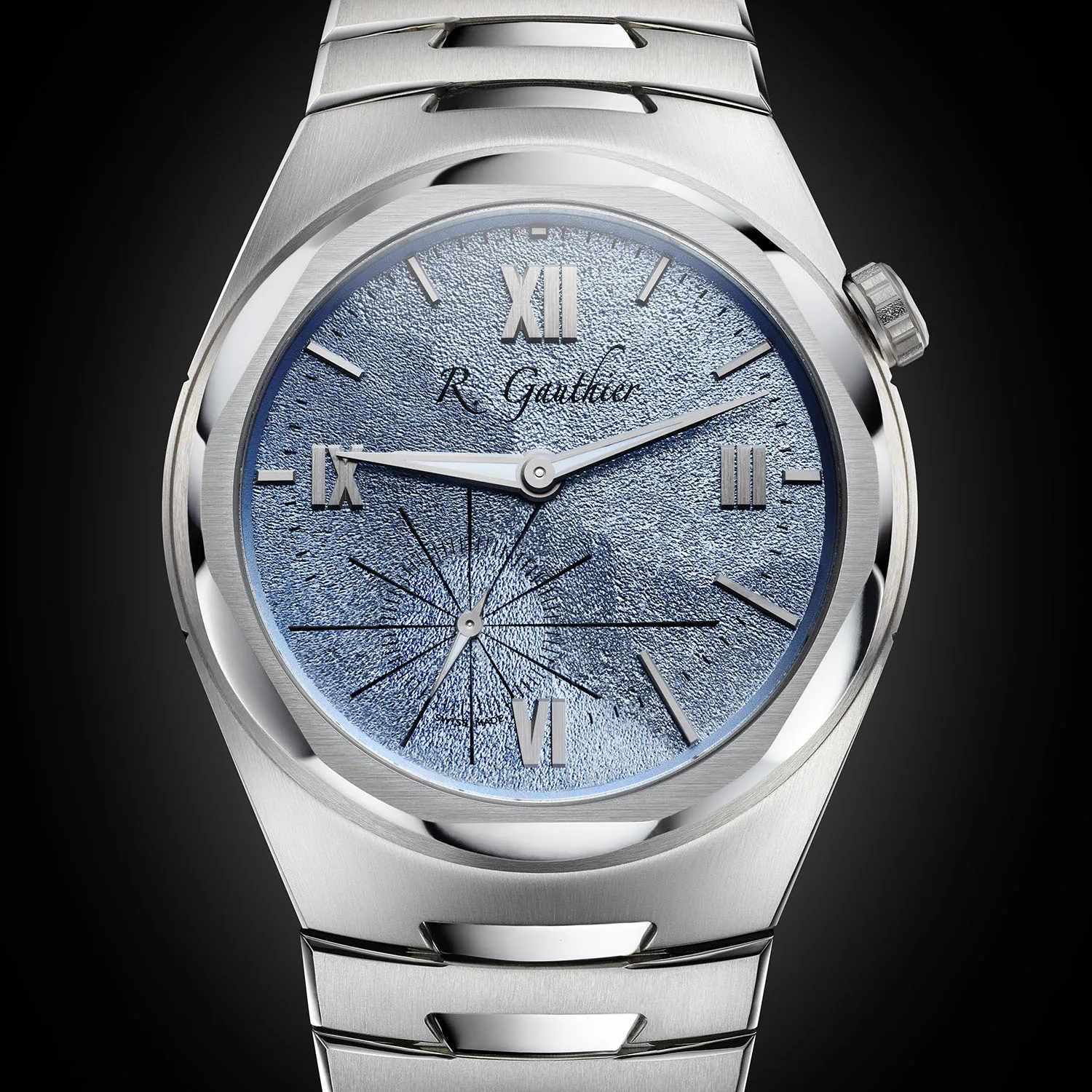 While it may have the air of being ‘just another integrated bracelet watch’, don’t be so quick to write this one off. The dial is crafted from white gold and finished in a guilloché style known as bouchardé which translates as bush hammered. A bush hammer is a type of tool used in stone masonry which adds texture, the head has a similar spiky texture to a meat tenderiser. Here, it creates a wonderful pattern and a blue PVD coating gives it its colour. The offset small seconds, a feature of Romain Gauthier’s designs, feature here to good effect making this not your run-of-the-mill watch.