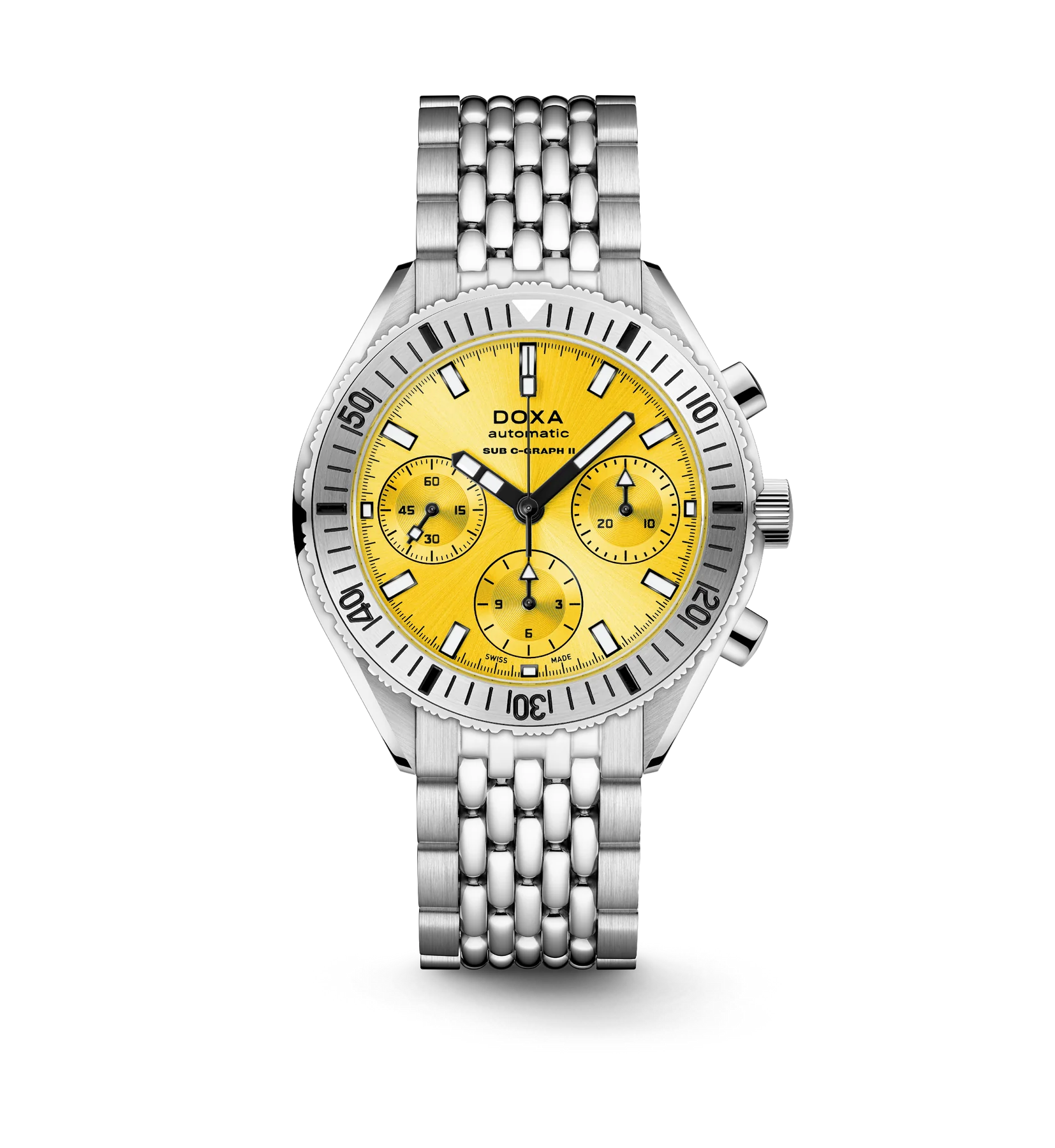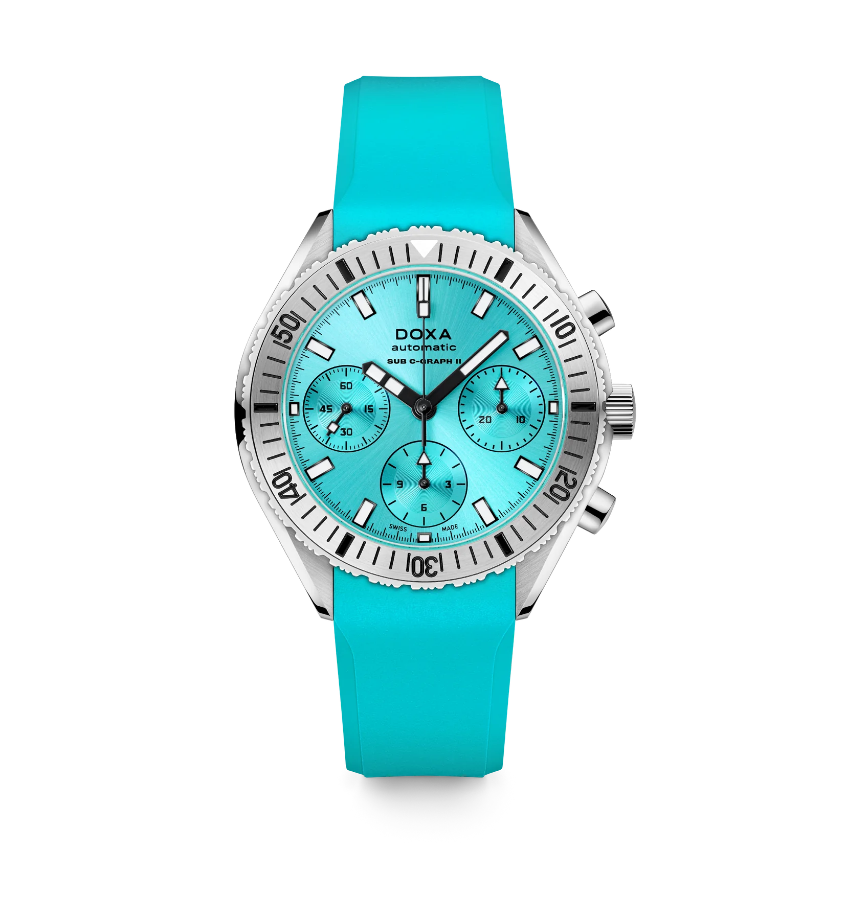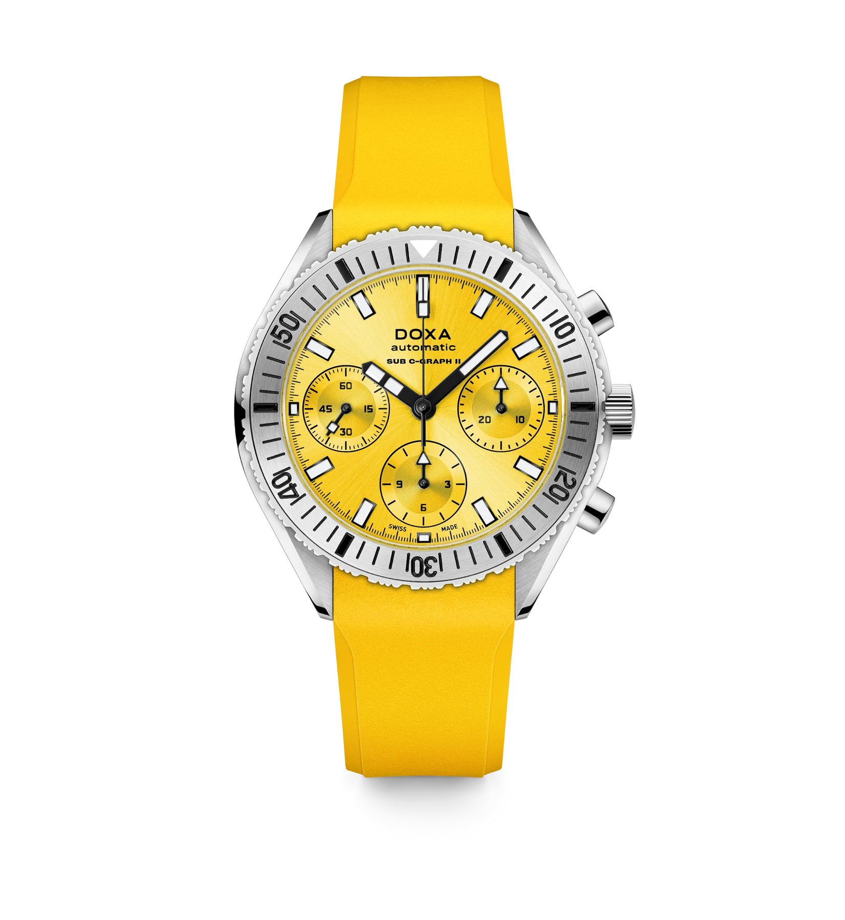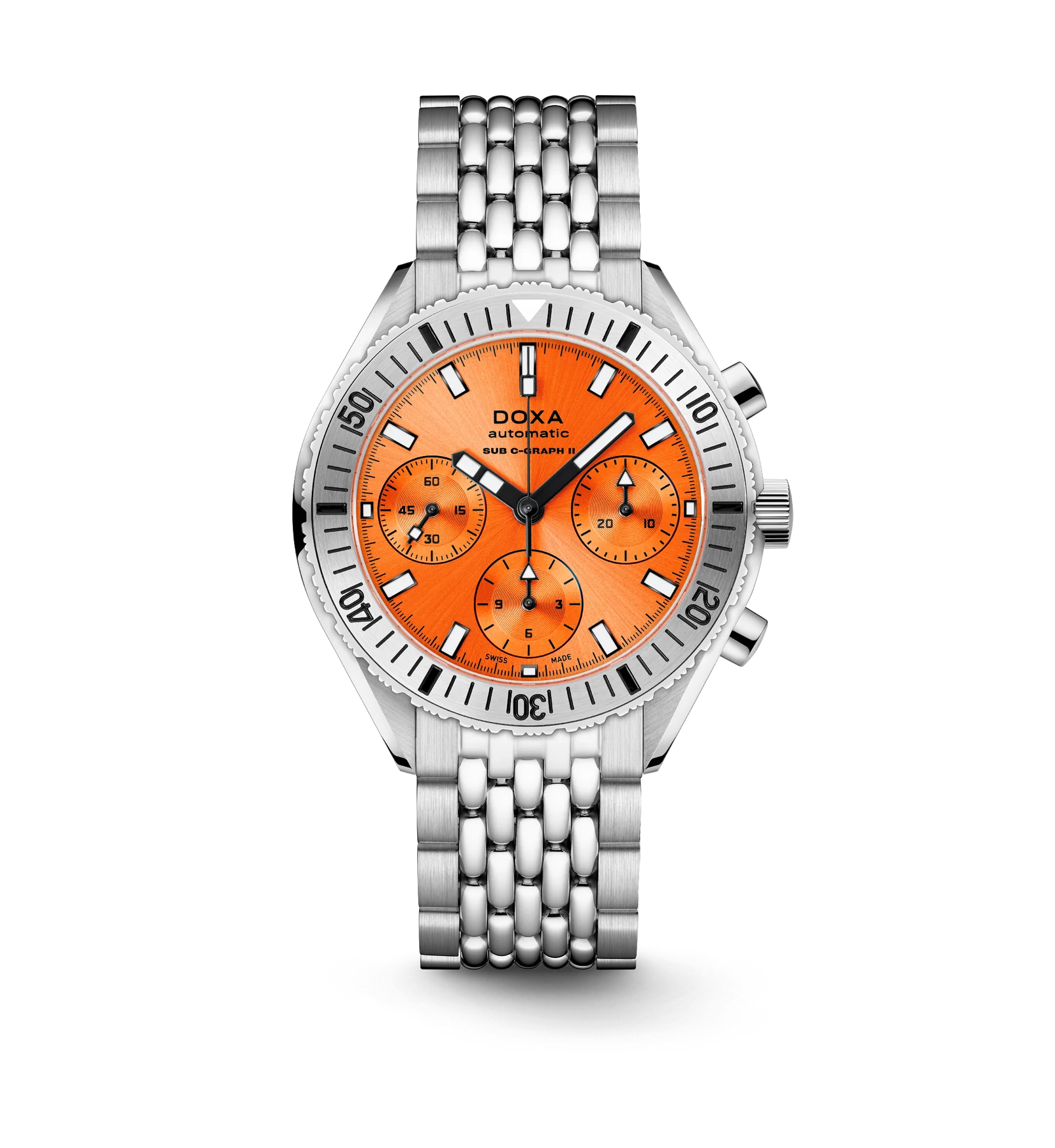 The dial of the Doxa SUB 200 C-Graph II is available in six colors and has a sunray-brushed finish. That’s also the first time Doxa’s famous dial colors have been given a sunburst finish. The watches come in yellow, orange, turquoise, black, dark blue, and white/silver. The yellow, orange, and turquoise models have a brushed steel insert with a fully graduated diving scale in black, while the black and dark blue models feature a tone-on-tone brushed ceramic bezel insert. The white/silver version is available with either a white ceramic or a brushed steel insert. All watches feature luminous markers and hands, including the chronograph counters, for optimal visibility in low-light settings.