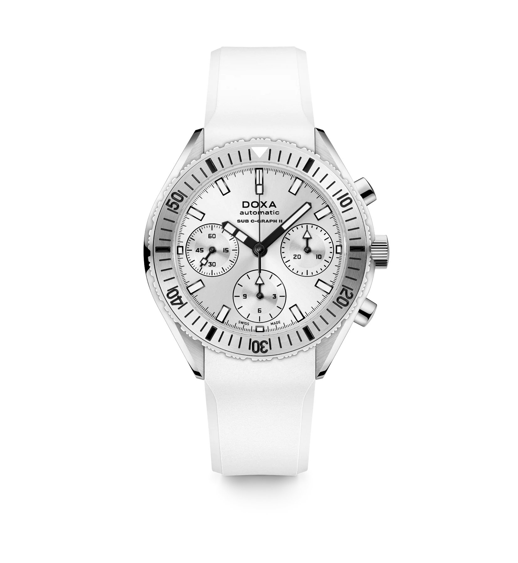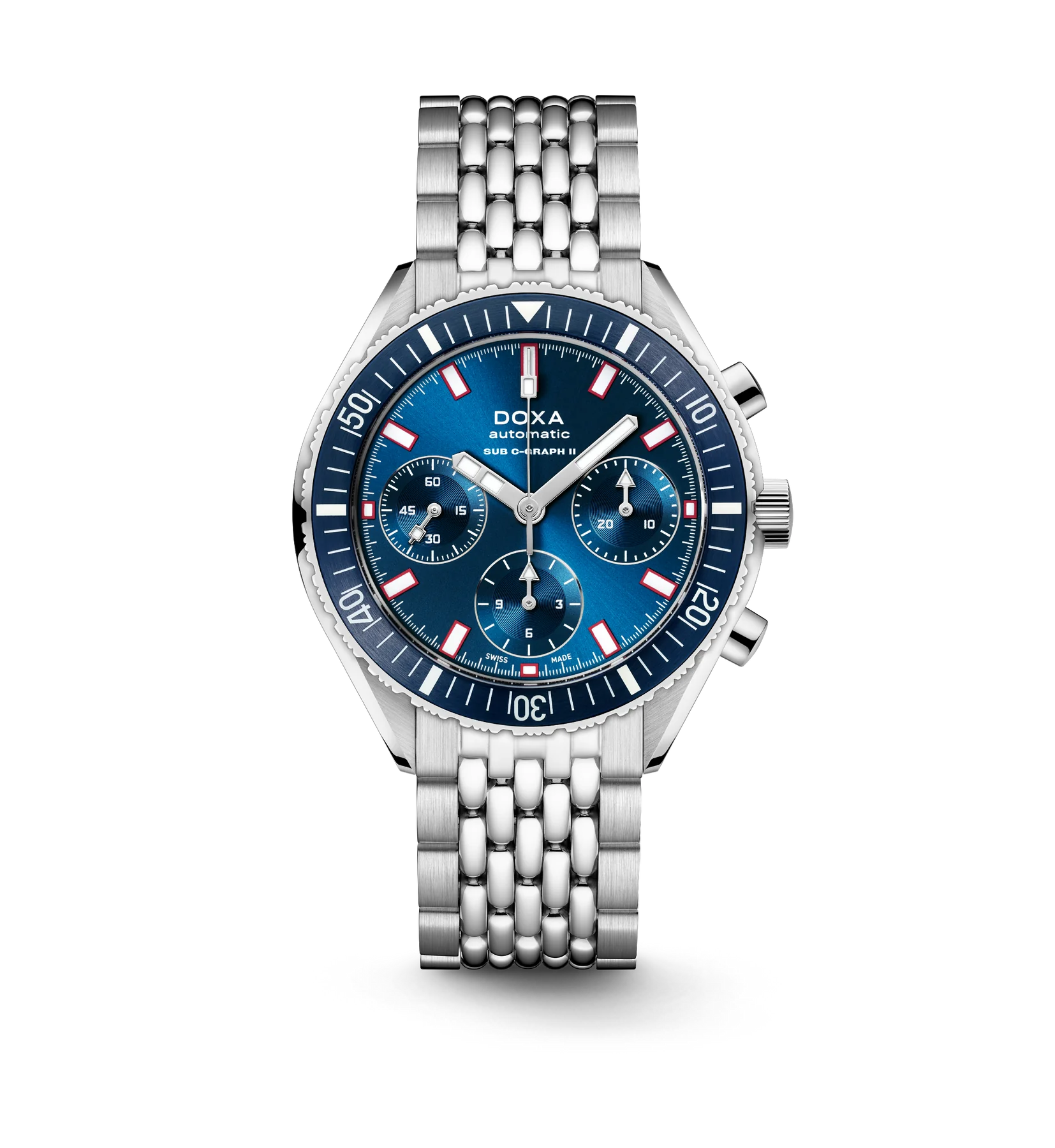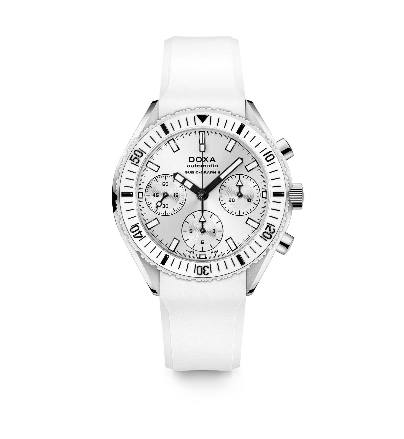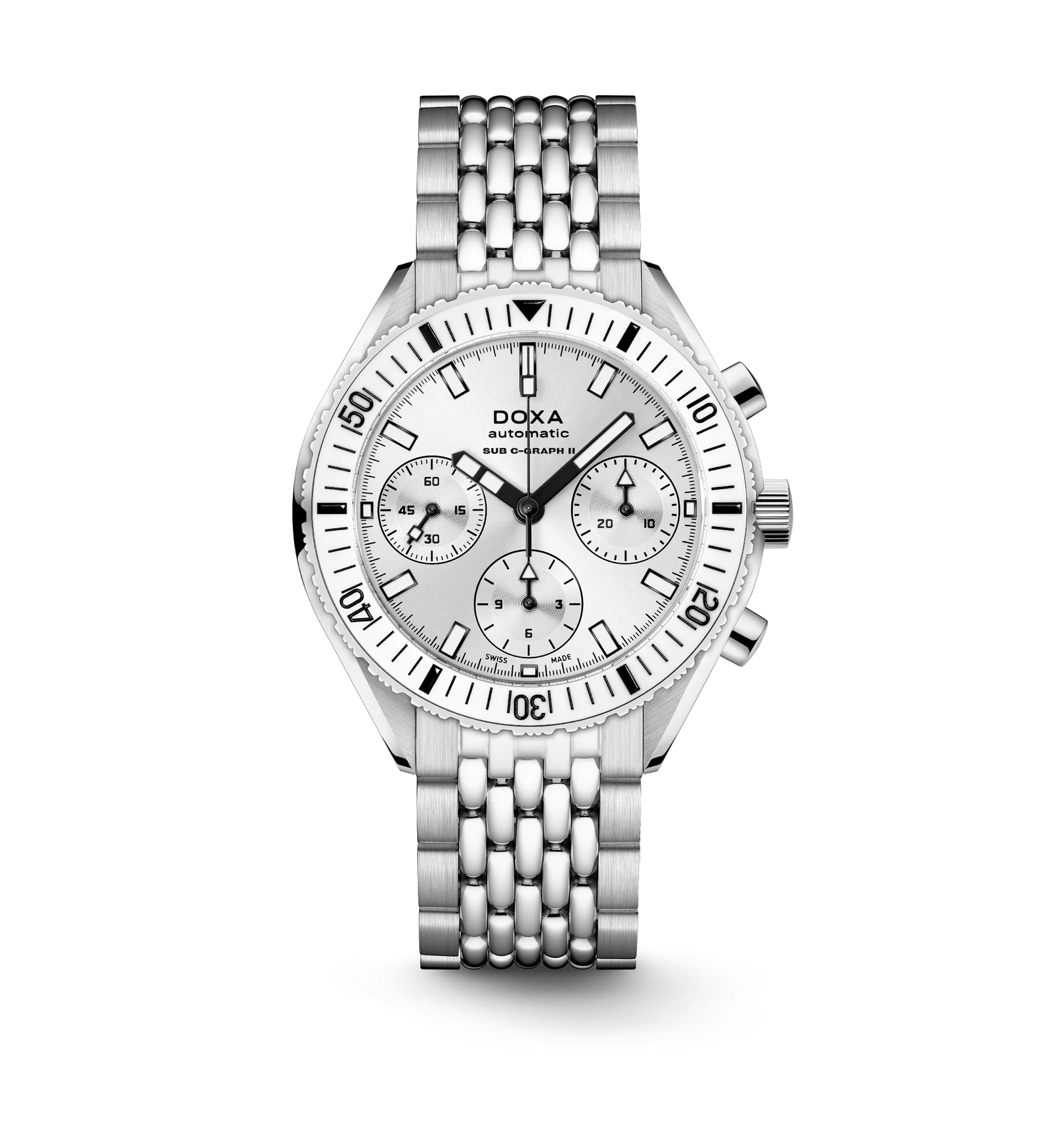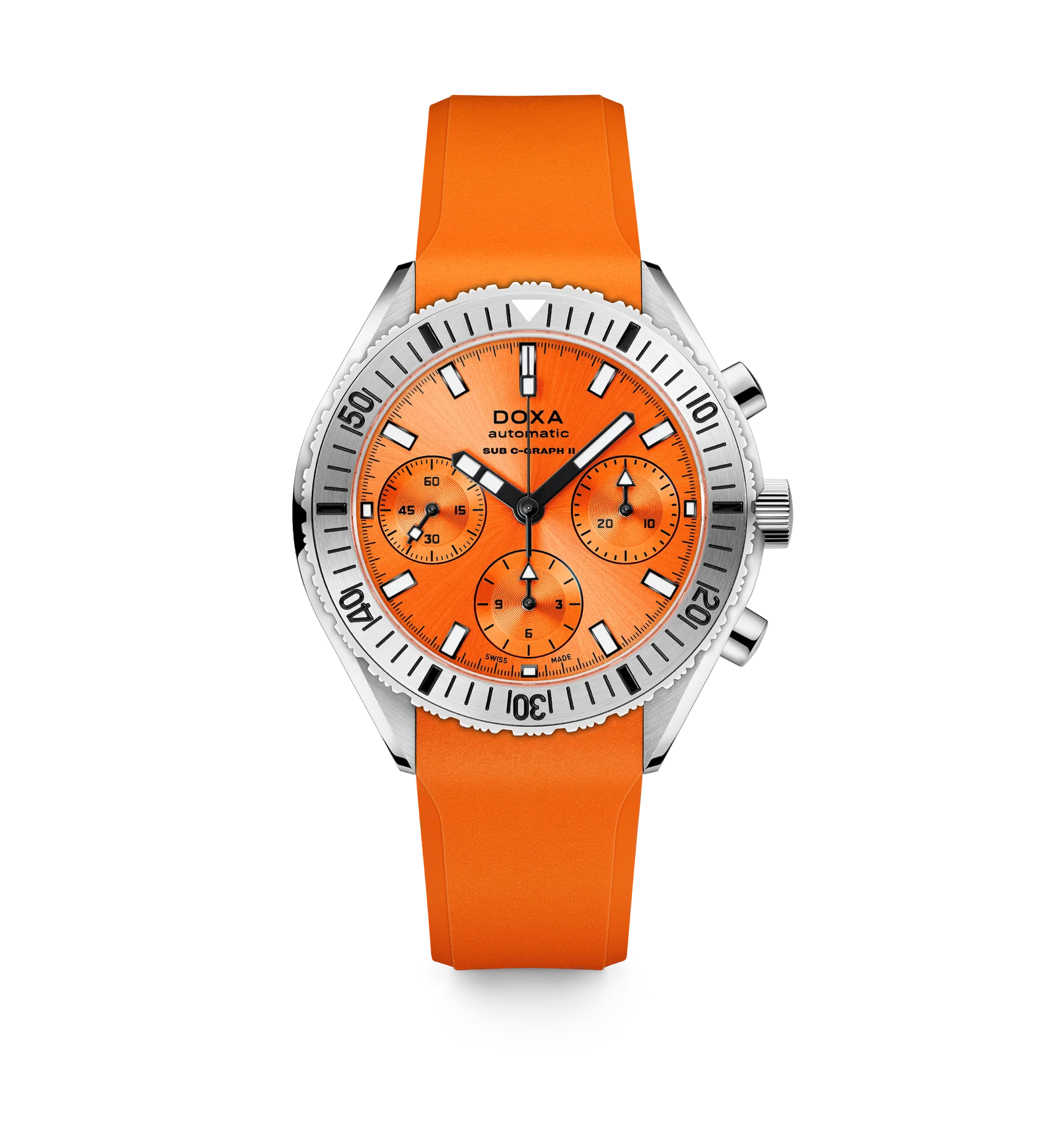 The dial of the Doxa SUB 200 C-Graph II is available in six colors and has a sunray-brushed finish. That’s also the first time Doxa’s famous dial colors have been given a sunburst finish. The watches come in yellow, orange, turquoise, black, dark blue, and white/silver. The yellow, orange, and turquoise models have a brushed steel insert with a fully graduated diving scale in black, while the black and dark blue models feature a tone-on-tone brushed ceramic bezel insert. The white/silver version is available with either a white ceramic or a brushed steel insert. All watches feature luminous markers and hands, including the chronograph counters, for optimal visibility in low-light settings.