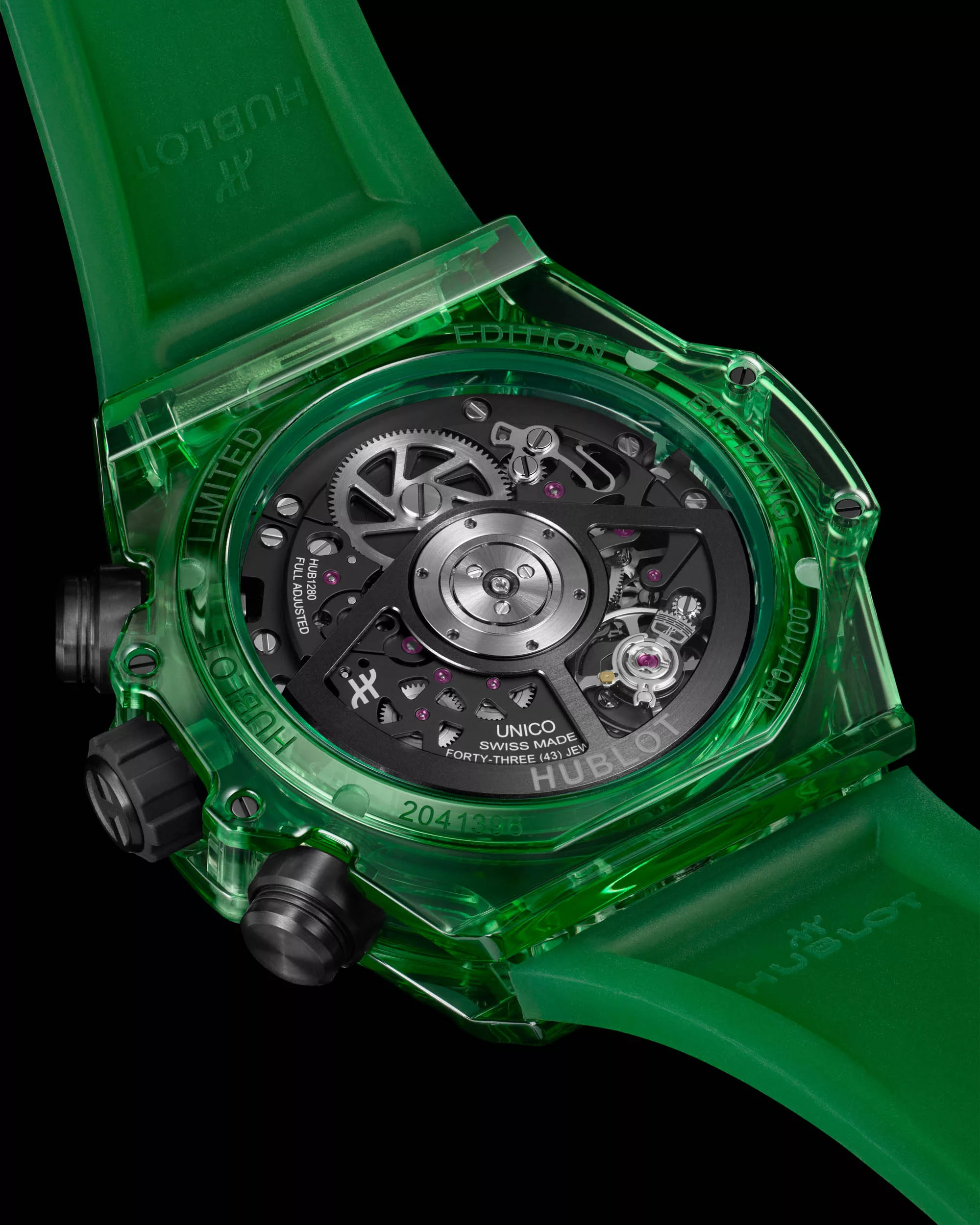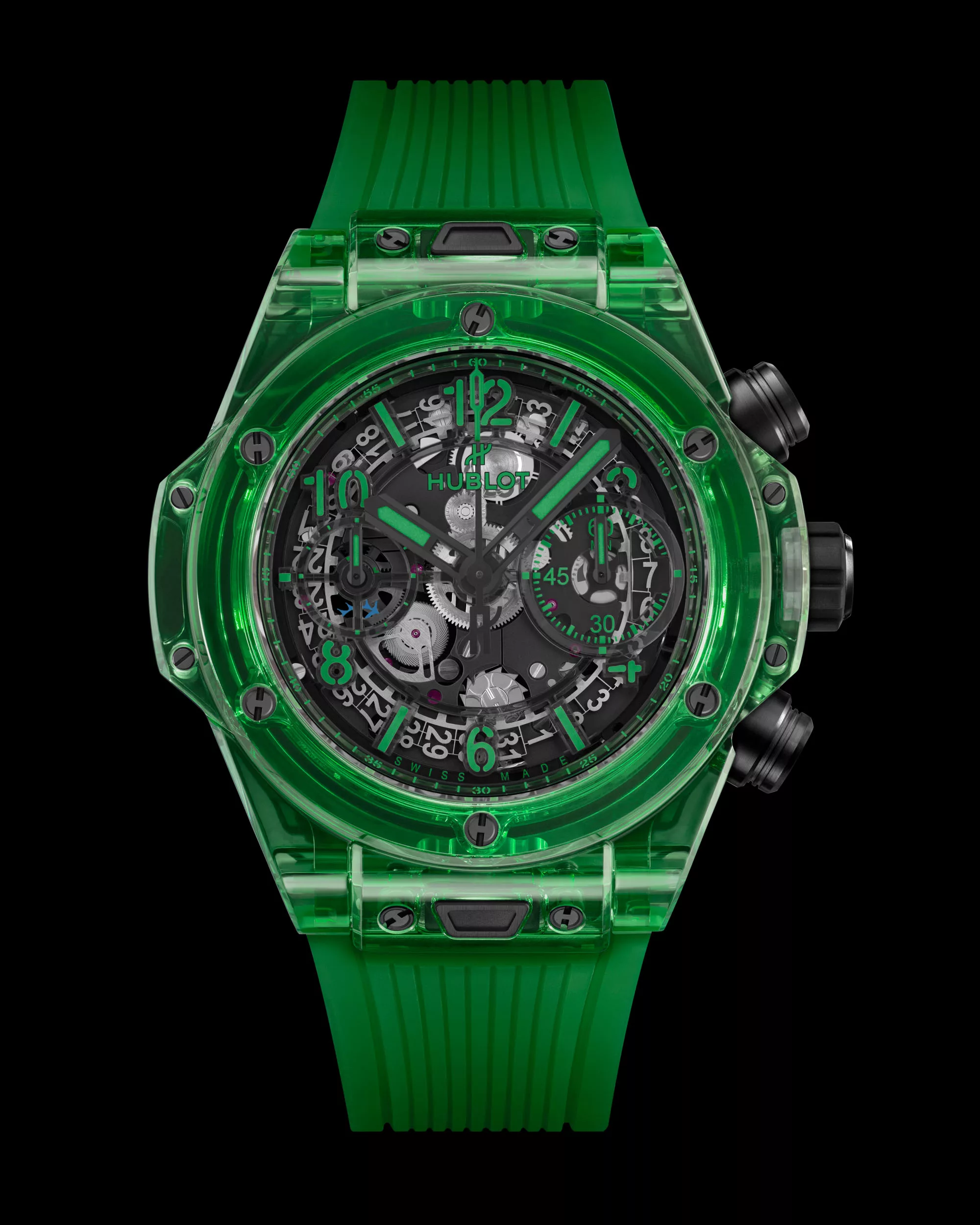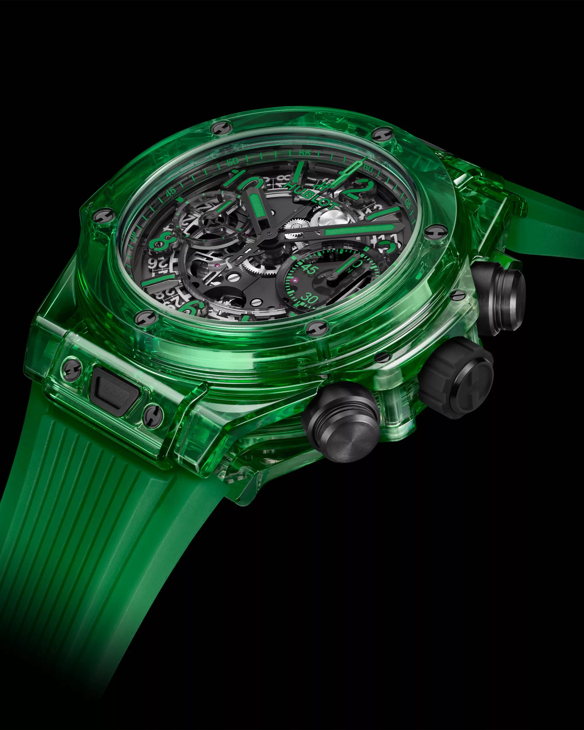 What’s different about this watch, apart from the colour, is the case material. The clue is in the name, it’s called the Big Bang Unico Green SAXEM 42mm. SAXEM is an anagram of ‘Sapphire Aluminium oXide and rare Earth Mineral’. So, it is very similar to sapphire crystal, but according to Hublot, the use of SAXEM means that the colour of the case is much more obvious and eye-catching than if it were to be some kind of coloured sapphire crystal, that’s thanks to the use of rare earth elements (although Hublot doesn’t state what those elements are). I think this material needs a bit more studying, but I haven’t had any coffee yet.