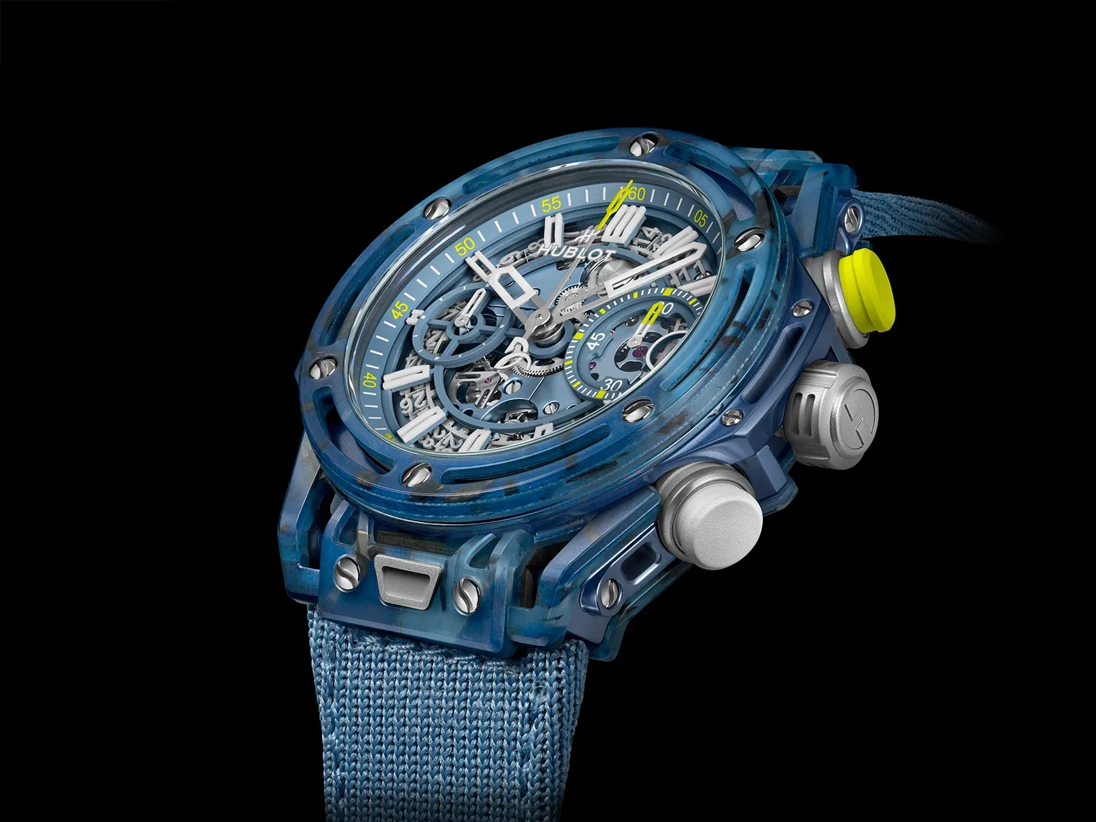 The case’s material isn’t the only place Hublot has been able to change things around in the name of lightness. The sapphire crystal is gone and has been replaced by tempered Corning Gorilla Glass which weighs up to half as much. Also, the movement’s plates, which are usually made of brass and therefore lumpen and weighty, are instead made of aluminium, which reduced the movement’s overall mass by nearly one-third.