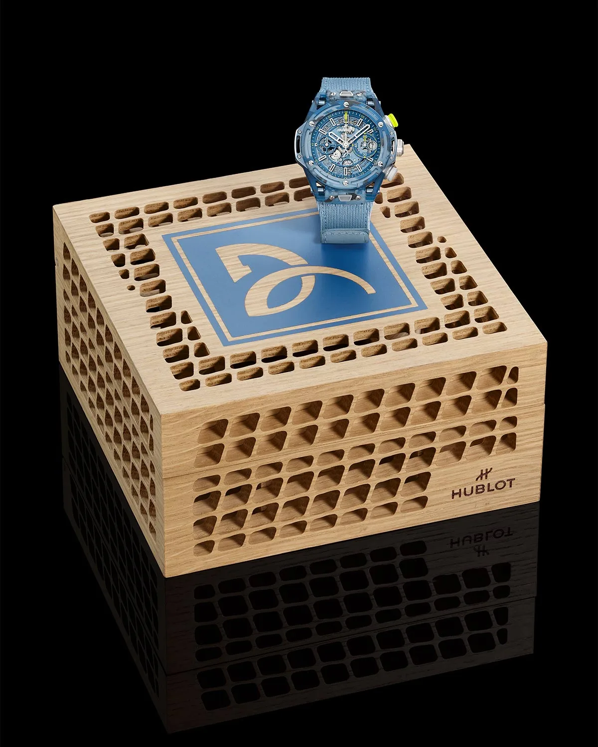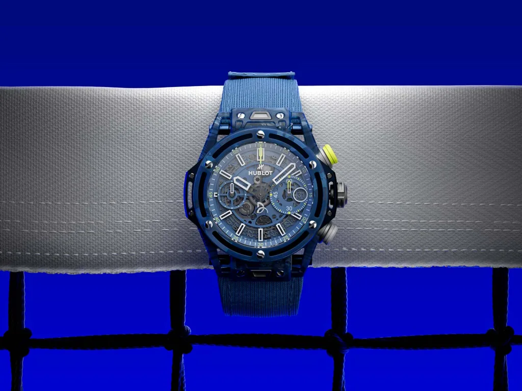 At first glance, I thought this watch was made of sapphire crystal which is a material Hublot is adept at making and colouring. However, this watch’s case is probably its most intriguing feature. The case measures 42mm x 14.5mm with 100m of water resistance and the entire watch weighs 49.5 grams, less than a tennis ball, which weighs 56 grams. We’re still not at the most intriguing part yet, which is that the case is made of, but it’s made from recycling the Lacoste shirts (15 light blue and 17 dark blue) and 25 HEAD tennis racquets that Djokovic wore and used during his 2023 season. Hublot says that they cut the shirts with a specific pattern (presumably after washing them), crushed the racquets and combined them using epoxy resin with quartz powder into a watch case. It’s extremely unique and shows Hublot’s ability to make a watch out of seemingly anything (I have some ideas if you’re interested, Hublot).