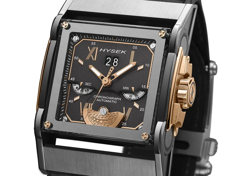 The movement is developed entirely in-house so it is as pure as it gets. The double micro-rotor is exclusive to Hysek brand. We can see the first micro-rotor on the dial side, made of solid 22k gold and engraved with the firm’s monogram while the second micro-rotor is seen through the case back.