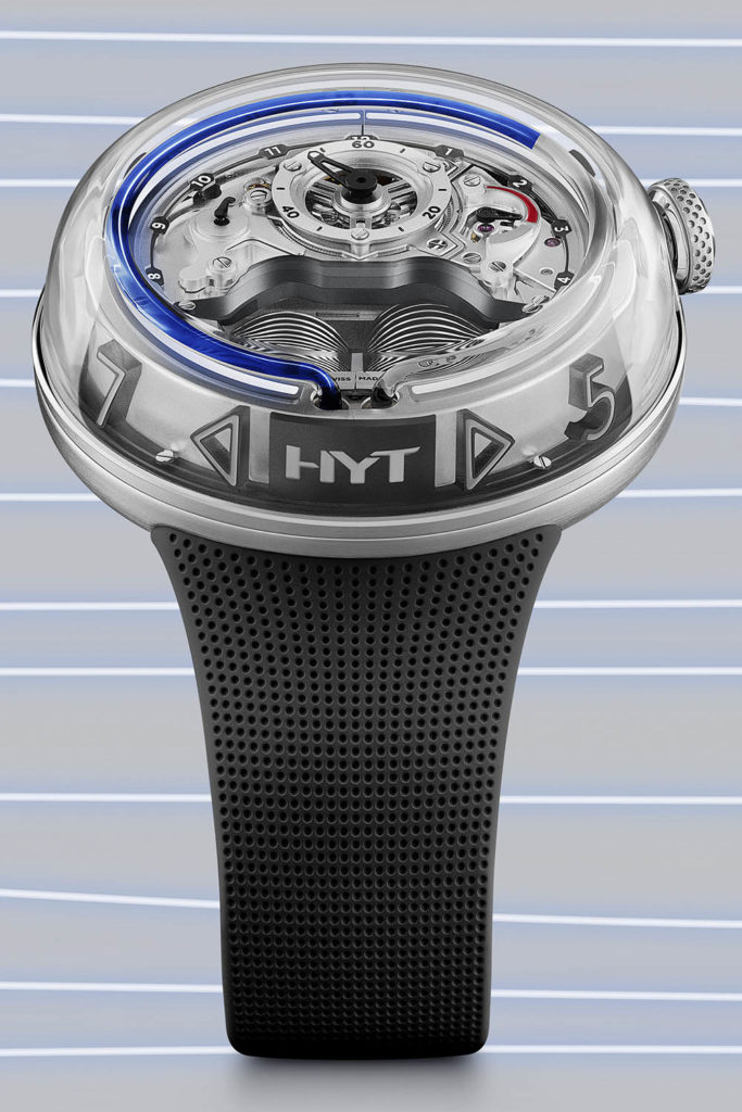 HYT’s watches use a tube connected to bellows to move liquid in such a fashion that it can be used to indicate the time. The capillary tube to hold the liquid has to be made by a company outside of HYT that specialises in glassmaking, and the liquids inside that tube need to avoid mixing. To get the effect that the blue fluid is travelling inside that watch by itself requires the use of a transparent one in front of it, a thick gel on its own might leave a residue or get stuck and ruin the effect, which is not something that can be allowed to happen on a €55,000 watch.