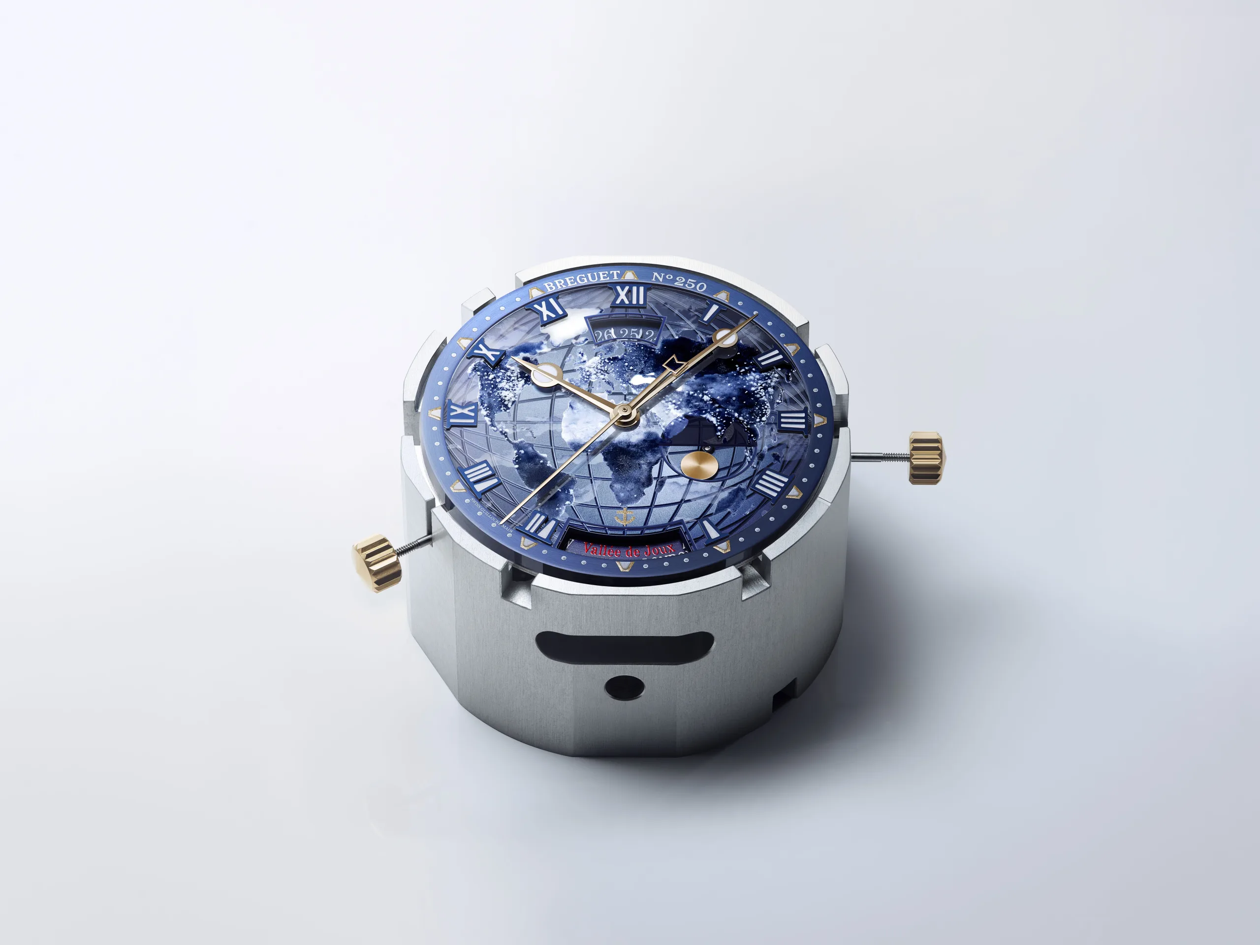 The dial is special for this watch. The base of the dial is an 18k Breguet gold (their proprietary alloy released earlier this year) plate engraved with latitudes and longitudes, it’s then coloured in blue. Sat above that is a sapphire crystal map with the continents painted in grand feu enamel, clouds are also painted in grand feu enamel while the city dots are marked in fluorescent paint.