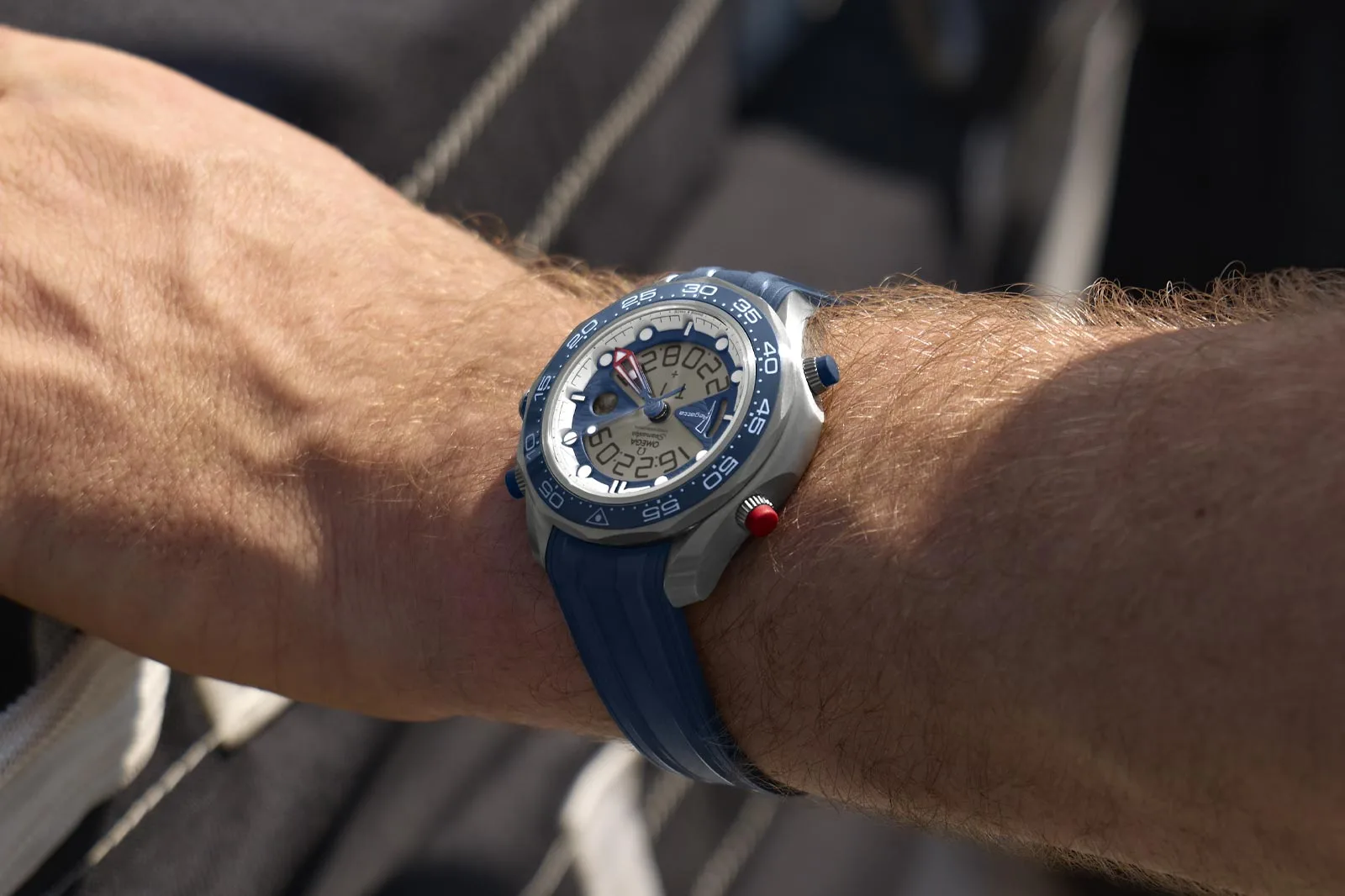 For 2024, Omega releases the Seamaster Regatta watch which at first glance bears a resemblance to existing models like the Speedmaster Skywalker X-33. Whereas that model is designed for soaring through the high skies and beyond, this model is more at home on the shimmering blue oceans and, to a small extent, below them. Despite this being a part of Omega’s Seamaster range and looking like a Seamaster 300m Diver, and despite the huge titanium case measuring 46.75mm x 15.6mm, this watch is only water resistant to 50m. I’m sure some people have closed this article and facepalmed. However, there is a reason for this.