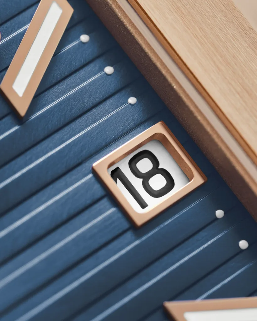 Hour markers are broader and sharper, and the ref. 5822P-001 platinum version shakes things up with an asymmetrical day-date and moon-phase display.