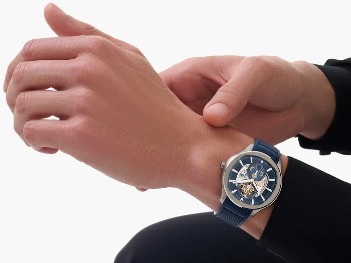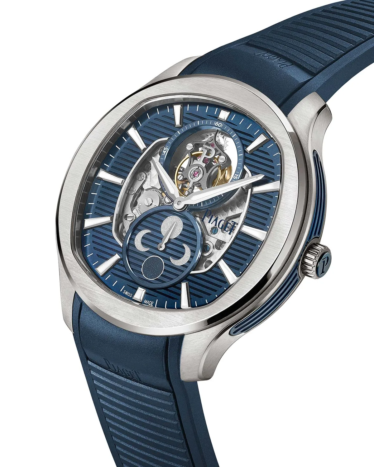 The watch is quite large at 44mm across, but it’s thin at just 9.8mm in thickness – I’d be disappointed at a thick Piaget piece. The fact that the case is 100m water resistant means this watch offers a modicum of practicality too. It’s also made of titanium to keep that weight down and it comes on an interchangeable blue strap. The blue dial is finished elegantly with horizontal striping and a large cutout offering a generous view of the movement.