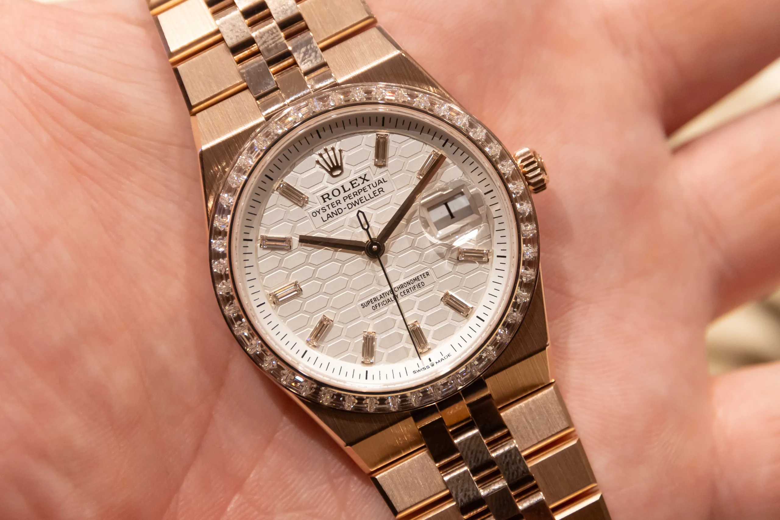 The Land-Dweller is initially being offered in two sizes: 36mm and 40mm with multiple variations of each, although both sizes offer a white Rolesor (Oystersteel with an 18k white gold bezel), 18k Everose gold and 950 platinum. We got to see a few variations of the Land-Dweller in person, those being the 36mm in Everose gold with the diamond dial and bezel (versions without diamonds are available), and the 40mm in white Rolesor and 950 platinum.