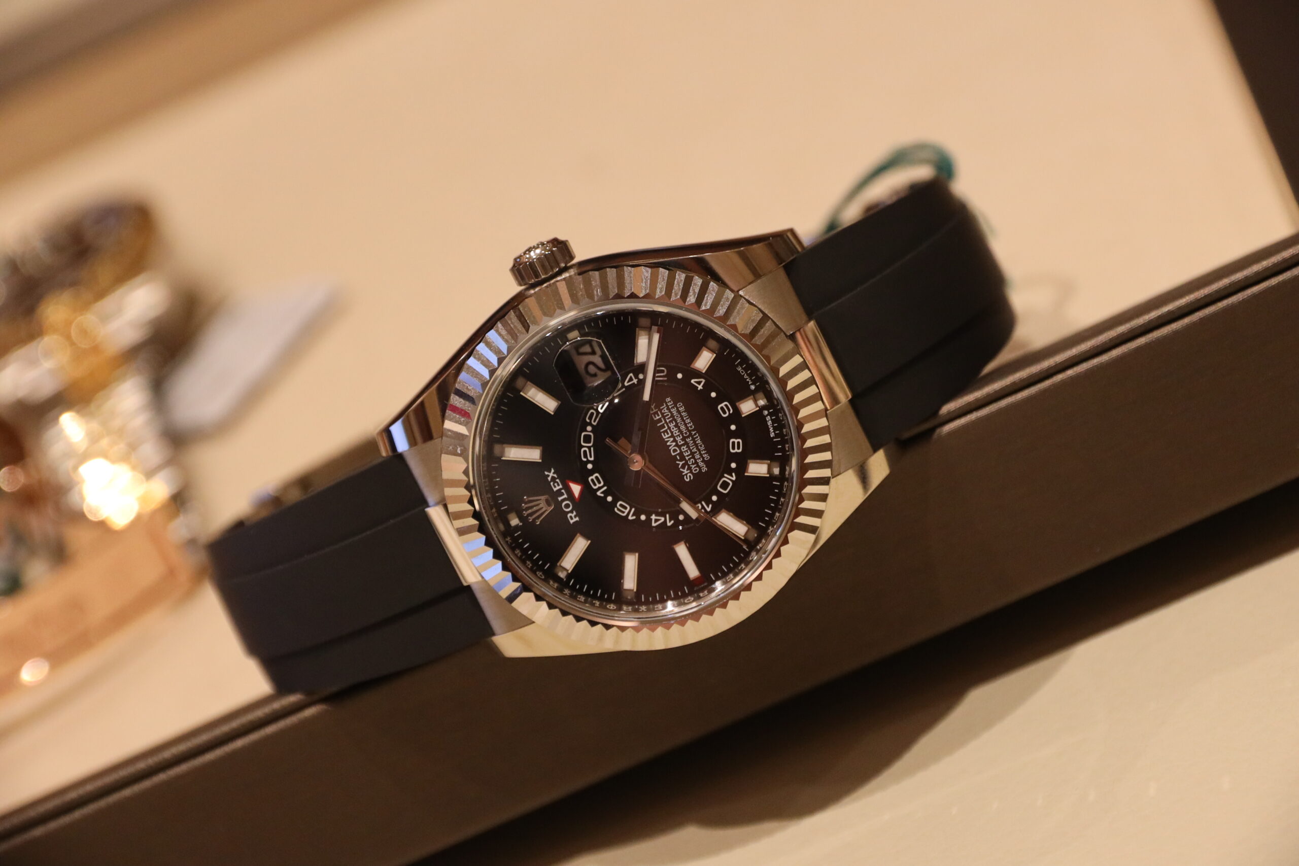 The new range includes a version of the Sky-Dweller in 18 ct white gold combined with a black elastomer bracelet. Two new dial colors have been introduced, including a mint green dial for the white Rolesor version, and a blue-green dial for the 18 ct Everose gold variant. The Sky-Dweller has a Ring Command mechanism that enables the user to swiftly and securely pick and adjust each watch feature individually.
