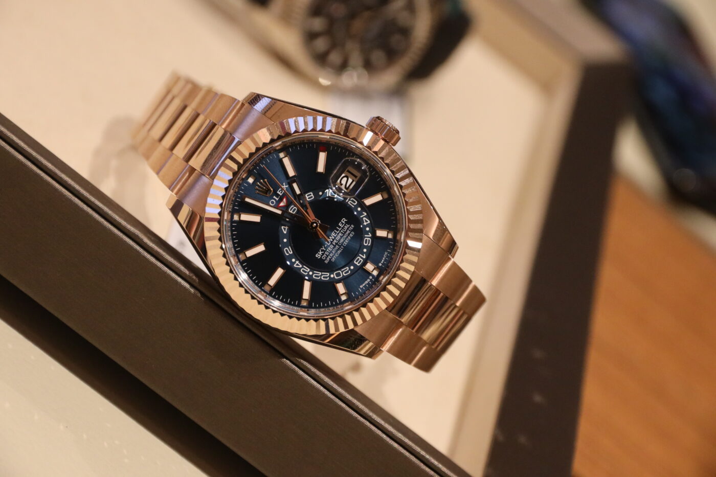 The 42mm Oyster case is waterproof up to a depth of 100 metres and is available in a solid block of Oystersteel or 18 ct white or Everose gold. The crystal, which features a Cyclops lens at 3 o’clock, is made of virtually scratchproof sapphire and has an anti-reflective coating.