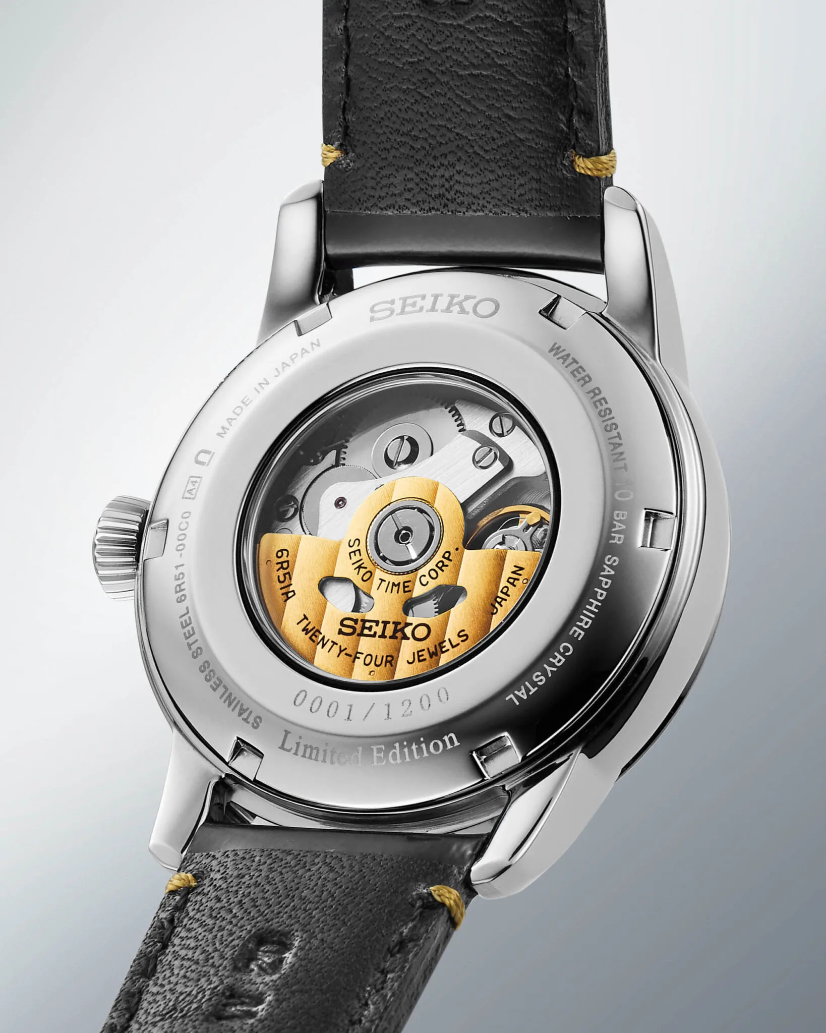 The SPB497 comes on a black leather strap with gold contrast stitches near the lugs, secured via a double push-button release deployant clasp engraved with Seiko’s signature. The SPB497 is priced at $1,850 USD.