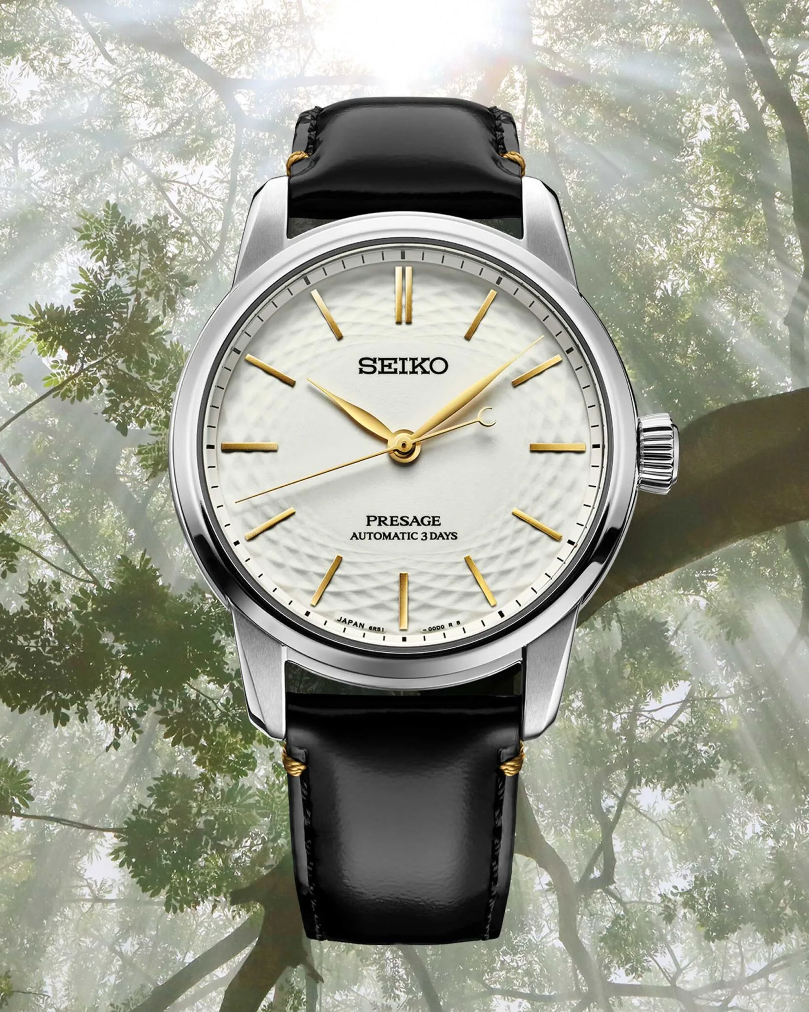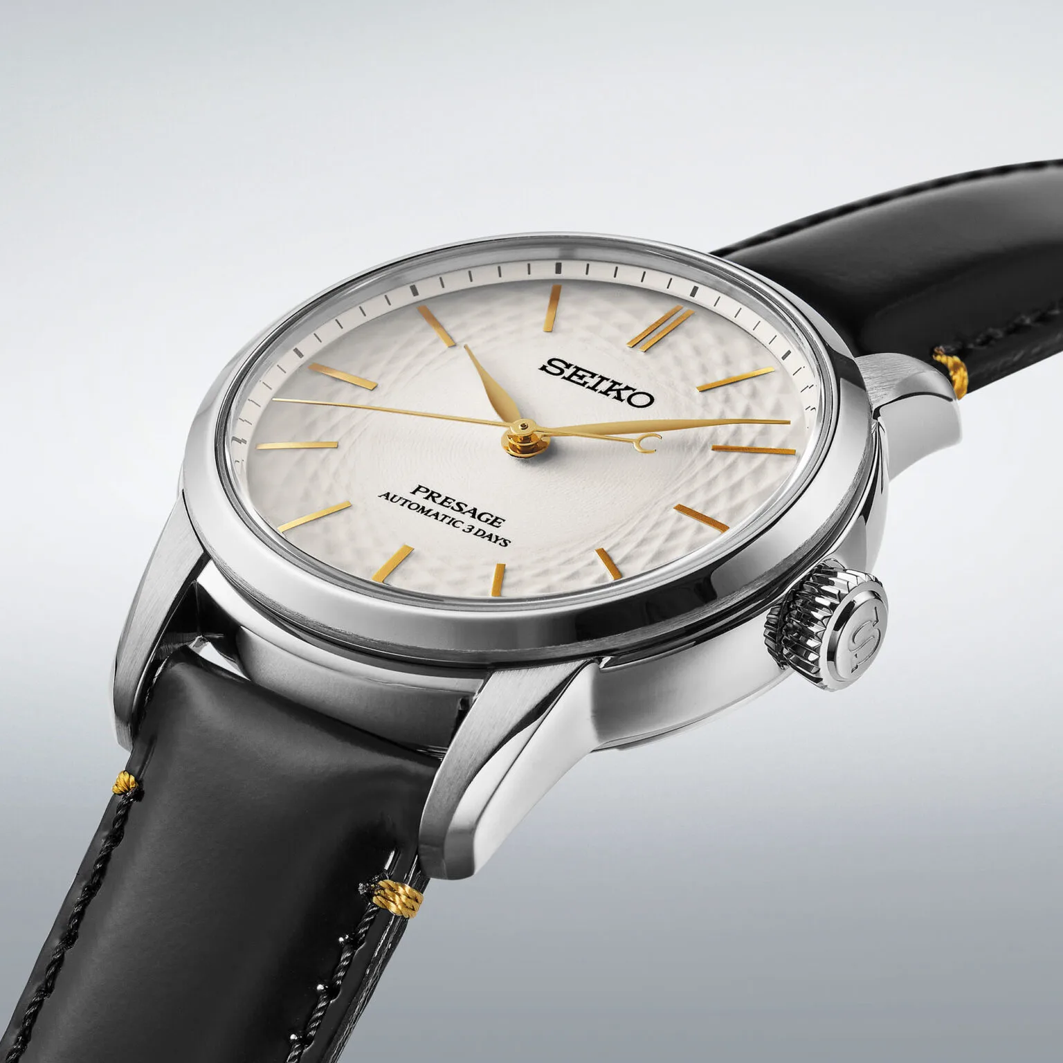 The dial is where the rubber meets the road. It’s unglazed Arita porcelain, a first for Presage, giving it a natural, matte feel. The absence of a date window keeps things clean and lets that modernized “hishi” (rhombus) pattern shine. That pattern is subtle, most prominent around the indexes, giving the dial a nice bit of three dimensional character. Gold colored hands and baton markers round it out, playing off the warm porcelain.