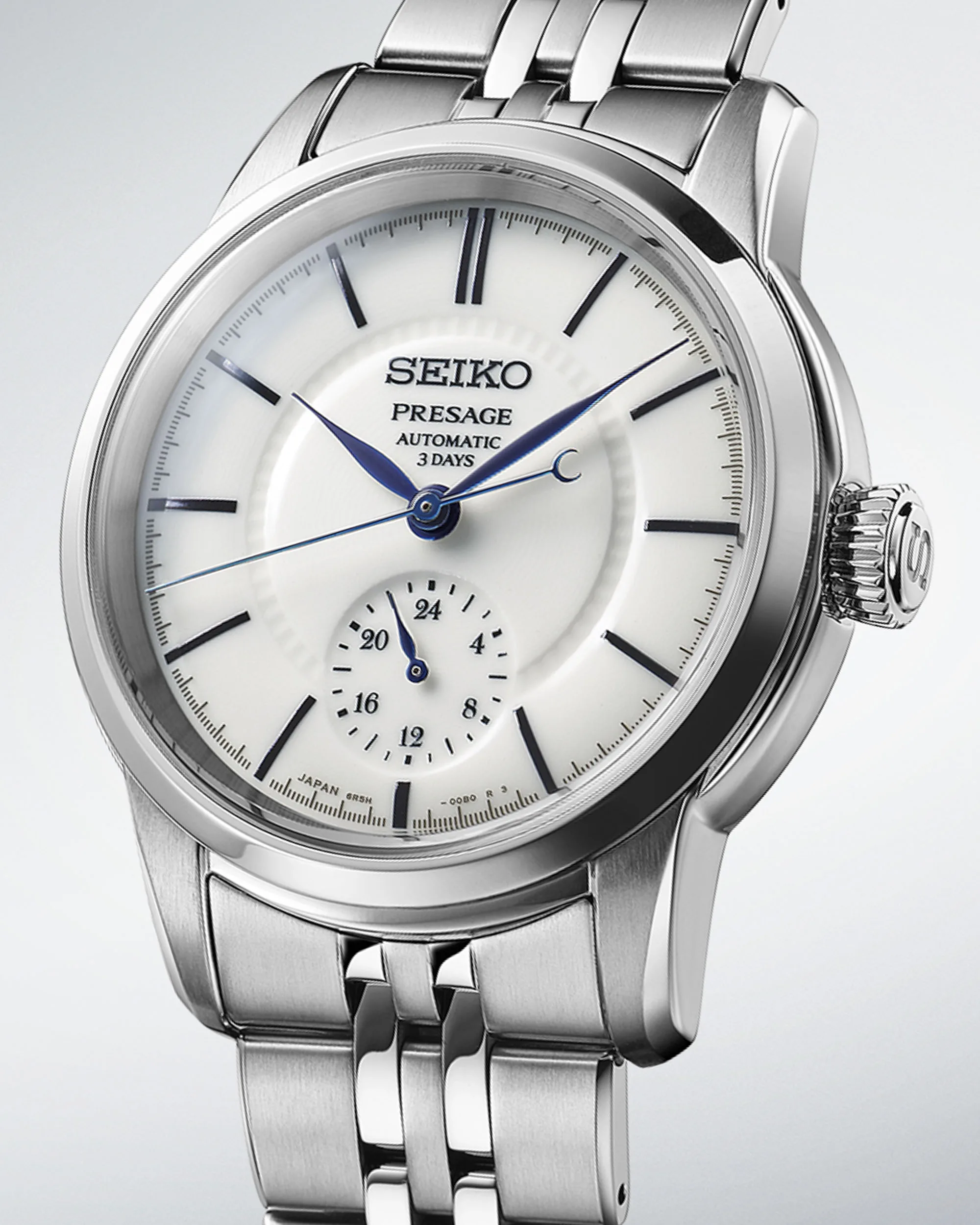 In Seiko’s newest watch, this art form is distilled into a clean and smooth dial. The white colouration is very pure, and there’s plenty of texture in the form of the 24-hour subdial sitting in its own ring and an hours ring gently set into the dial while the minute and seconds markers stand raised above. The blue contrast is nice, but I feel there’s too much writing on the dial. I think Seiko could’ve skipped the ‘Automatic’ and ‘3 Days’ text entirely.