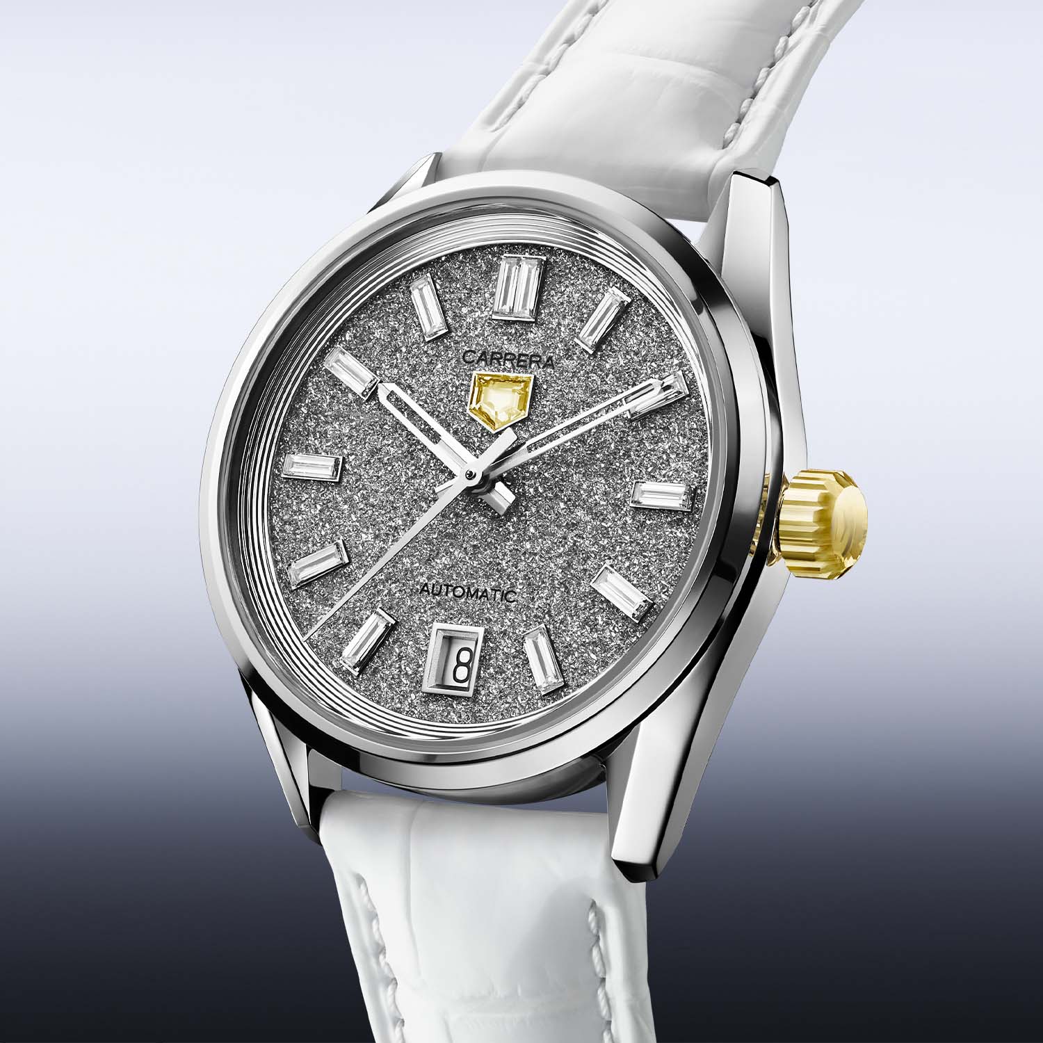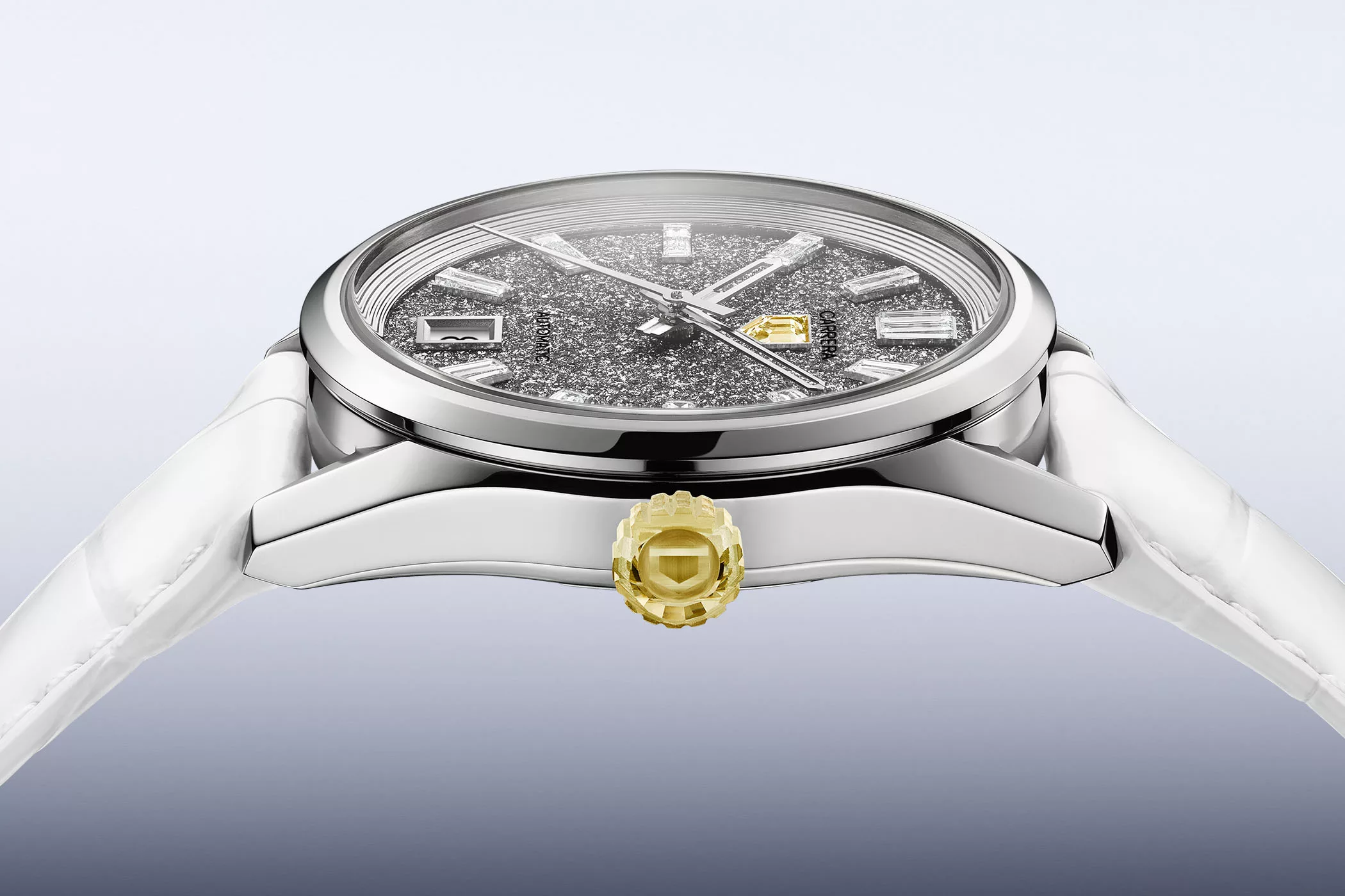 For LVMH Watch Week 2024, which is on right now, TAG Heuer unveils the new Carrera Date Plasma Diamant d’Avant Garde. One of TAG Heuer’s aims with its lab-grown diamond project is to perfect the art of making coloured diamonds, and it’s evidently done just that with this new piece. The TAG Heuer logo and the crown have been made out of yellow diamonds; in the natural world, coloured diamonds are much rarer.