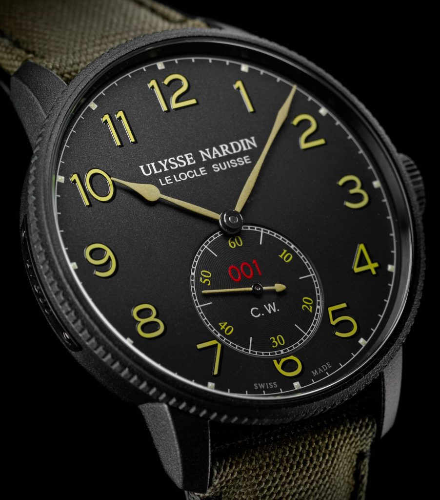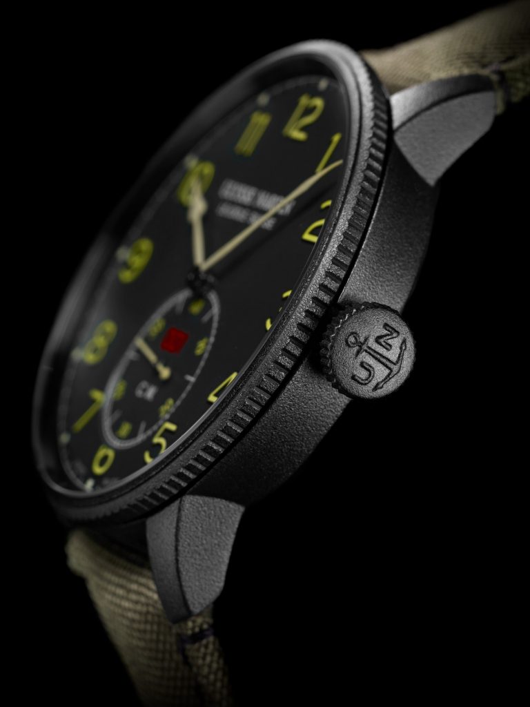 The dial on these watches has a very utilitarian look with some interesting details. The dial is characterized by bold Arabic numerals which have been nicely applied giving it a nice sense of depth and have also been filled with luminous paint to aid low light visibility. The black dial variant is complemented by green colored numerals and handset whereas the blue dial has white colored markings and text along with a golden handset. There is some nice pop of color on the dial in the form of the red colored limited edition number which sits within the large sub-seconds dial at 6. All in all, the dials are highly legible and time can be easily read using the nicely proportioned handset. One of my favorite things about these dials is that Ulysse Nardin has not tried to insert a date window in there keeping things plain and simple as a military watch should be.