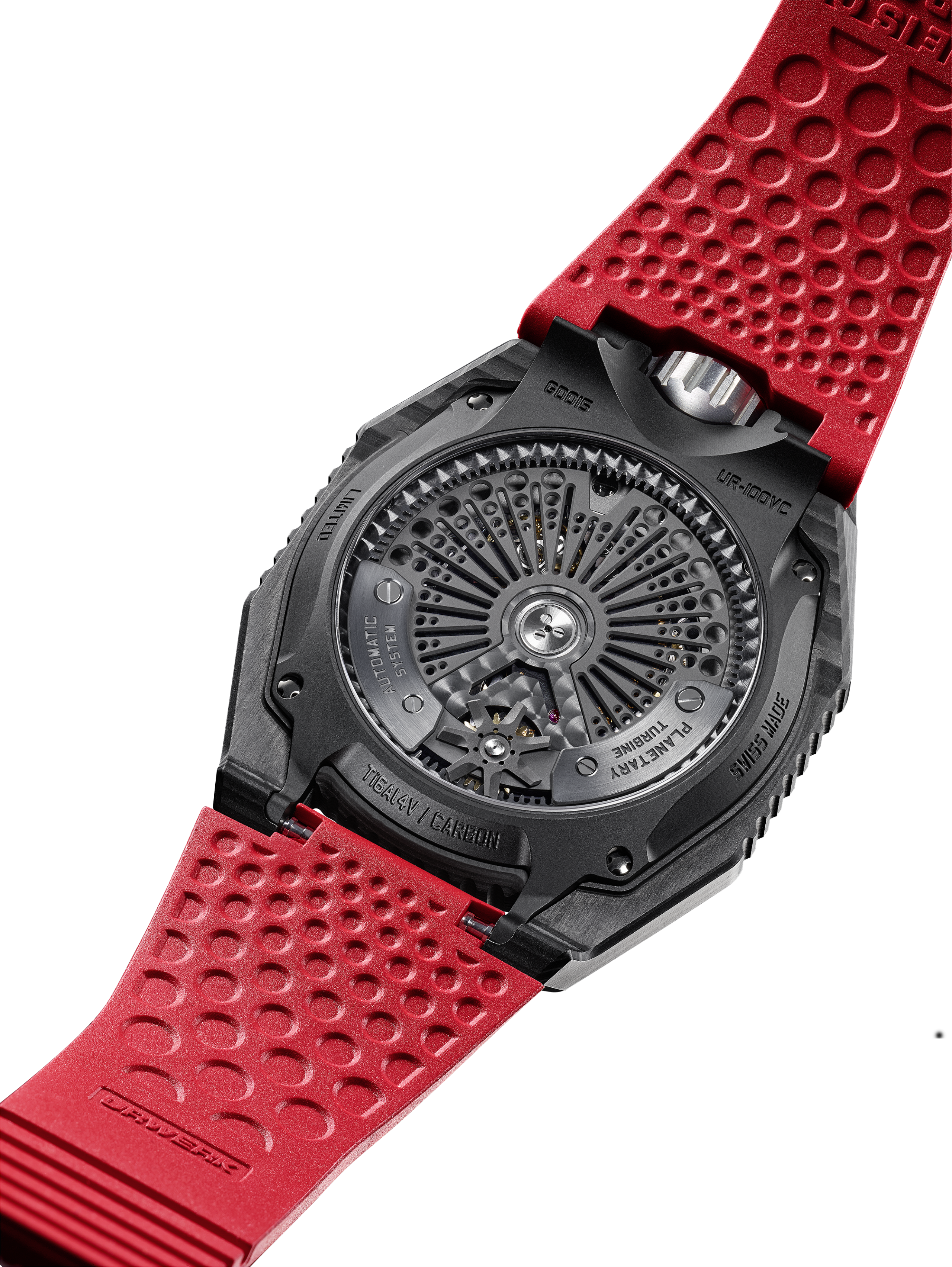 All of this is wrapped in a black carbon case, which has a Grade 5 titanium caseband and dimensions of 43mm x 51.73mm x 14.55mm, water resistance is 50m and the case comes on a textured red rubber strap with a blackened folding clasp attached. Although Urwerk hasn’t said precisely how many will be made, the complexity of the watch means they won’t be flying out of the factory, and even if they did they’re still expensive at CHF65,000 before taxes.