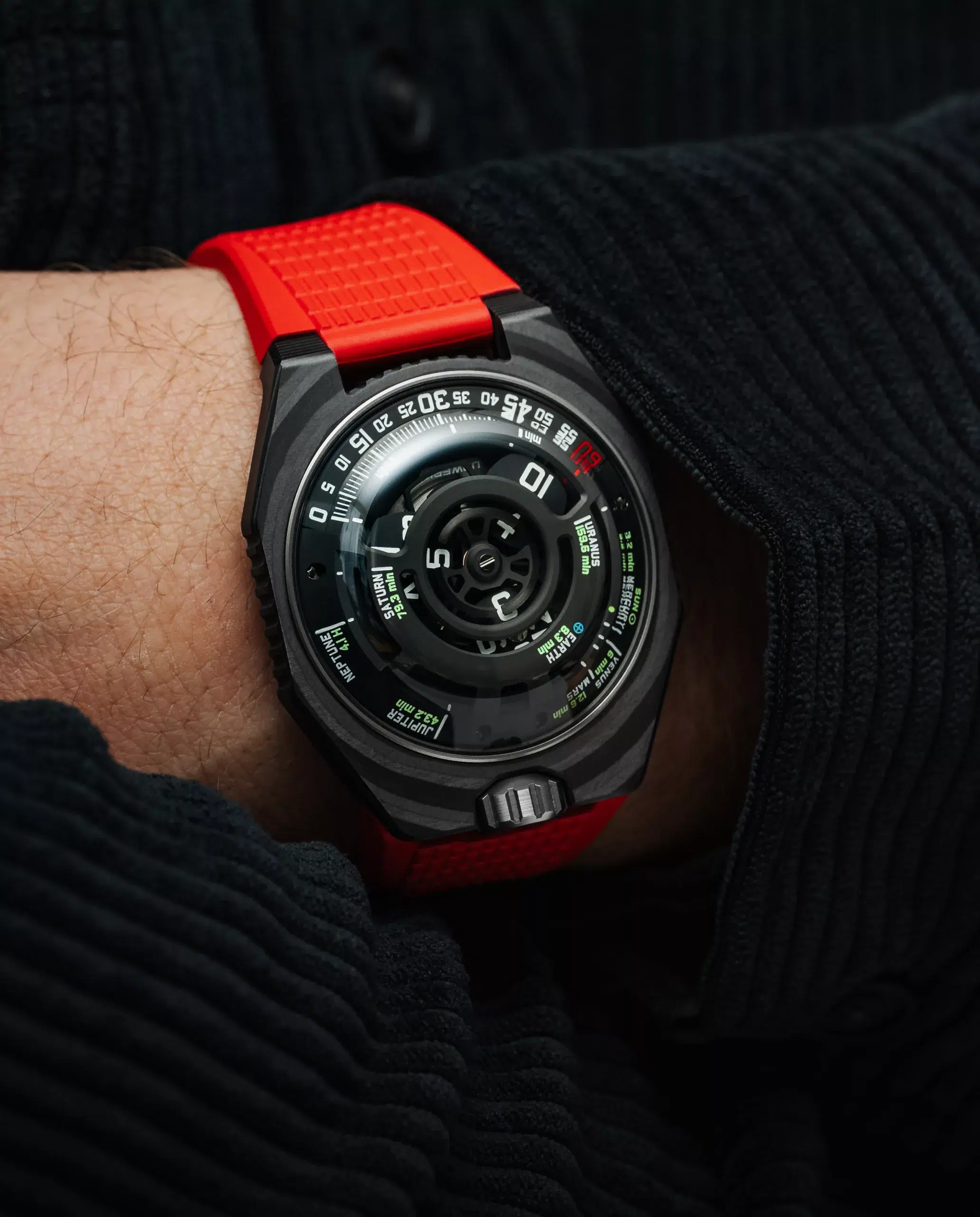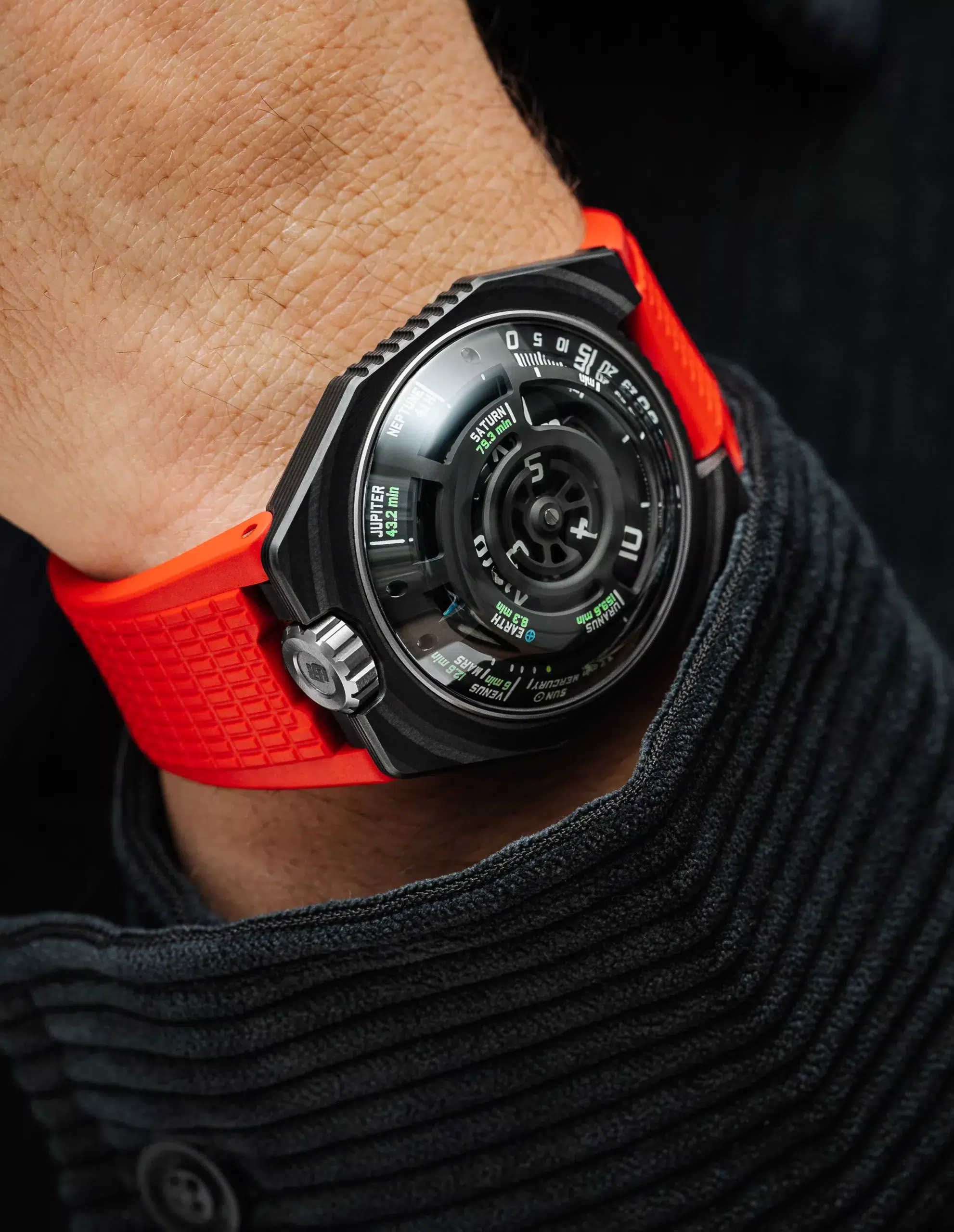 All of this is wrapped in a black carbon case, which has a Grade 5 titanium caseband and dimensions of 43mm x 51.73mm x 14.55mm, water resistance is 50m and the case comes on a textured red rubber strap with a blackened folding clasp attached. Although Urwerk hasn’t said precisely how many will be made, the complexity of the watch means they won’t be flying out of the factory, and even if they did they’re still expensive at CHF65,000 before taxes.