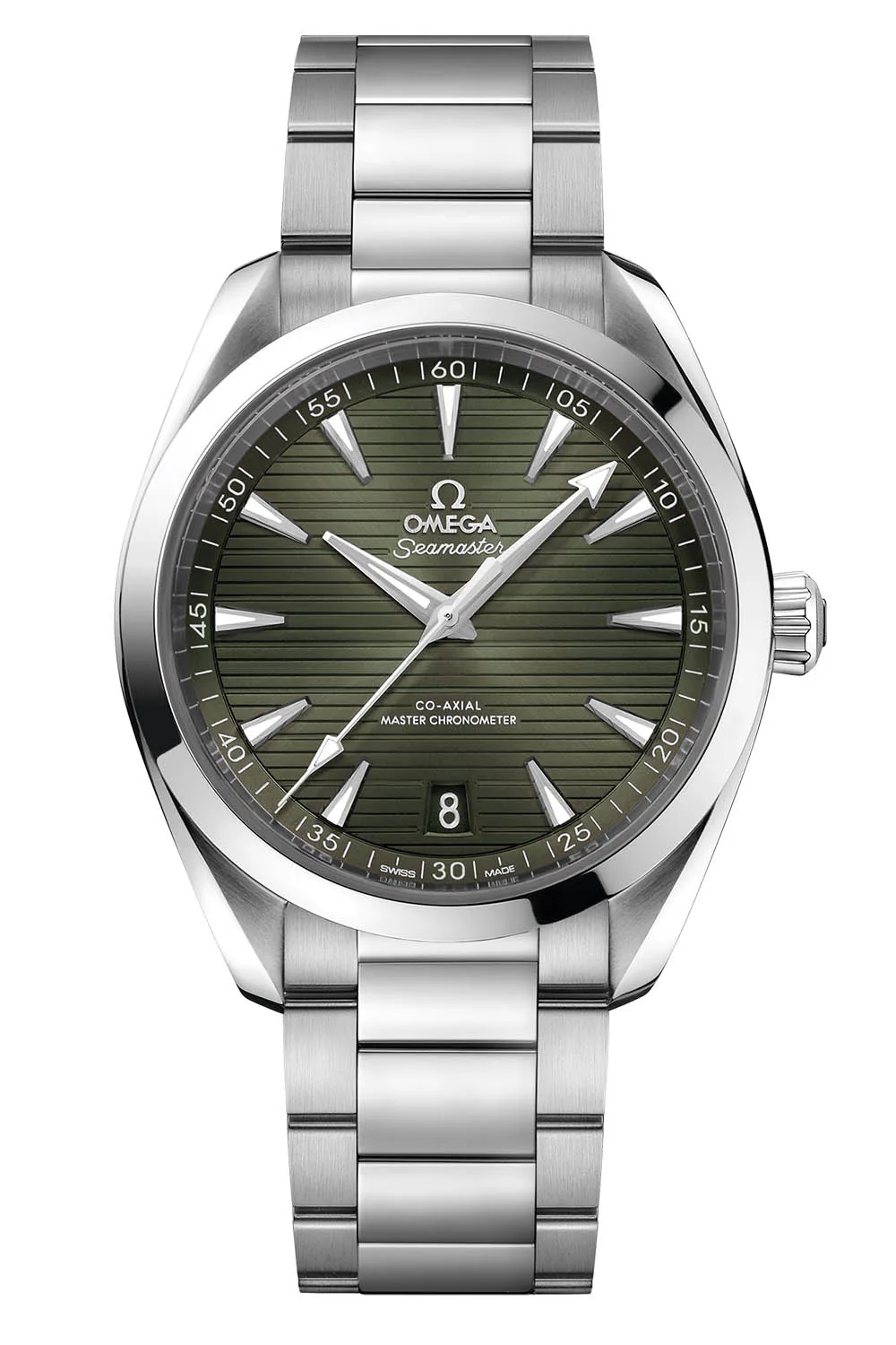 Omega’s Aqua Terra lineup received a thorough design overhaul back in 2017 and these new watches stick to the same formula. What that means is that you still have a dynamic looking teak patterned face with lume filled applied markers, a distinctive looking handset and a well-executed trapezoidal date window at 6. But the real talking point here is the new colorways. First up is a vibrant and fresh shade of blue and the other is a bold looking khaki green. While both colors look good in their own way, my personal vote goes to the green version, which is an uncommon color and lends the watch a slightly sportier and militaresque vibe.