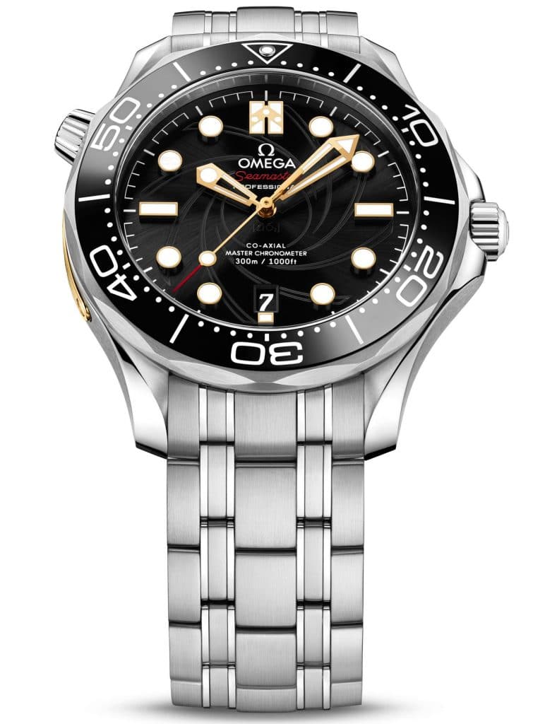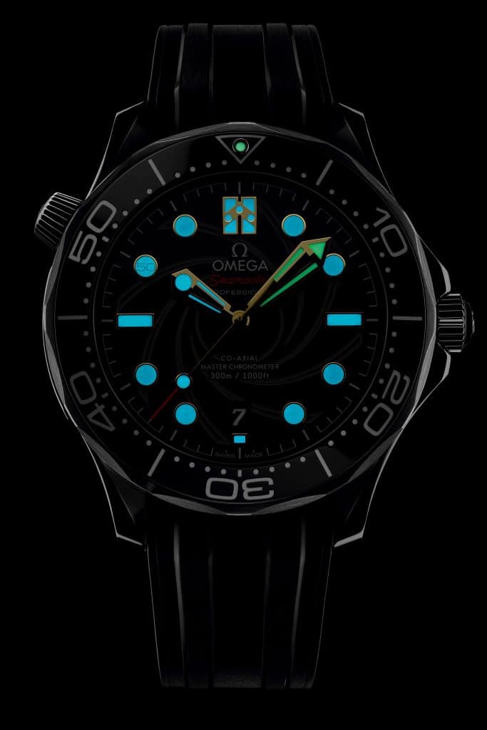 For this Bond variant, Omega used the recently revamped Seamaster Diver 300 as their base, a watch they’ve used in the past with great success like the reference 2226.80.00 for example. That watch replaced the characteristic wave dial with barrel rifling, which returns on this new Seamaster. The 12 O’clock marker now bears the Bond family crest, and the font in the date window at 6 O’clock is the 007 franchise font, rather than the standard used by Omega. While it’s not a criticism per se, it is worth noting that this all-steel watch uses 18K yellow gold for the hands and markers. That can go either way, I’ve seen watches that look good with gold hands and markers and some which look terrible, so it’s worth seeing this one in the metal before you jump in. There’s also a secret 50th-anniversary reminder here, in the 10 O’clock lume marker, the number ’50’ appears in the dark when the lume glows and disappears in the daytime. Neat.