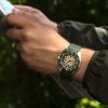 The case on the Omega Seamaster 300 is 42mm wide, 13.5mm thick and has a lug to lug distance of around 50mm all of which translates into a nice and chunky modern size for a dive watch. Made from 316 L stainless steel the case is beautifully finished and showcases a nice interplay between brushed and polished surfaces. Sitting on top of the case is the famous scalloped edge bezel which on this instance has a black ceramic insert that features a white enamel filled diving scale. At 3 o’clock is a threaded crown which makes the case water resistant to 300 meters and at 10 is a conical helium escape valve.