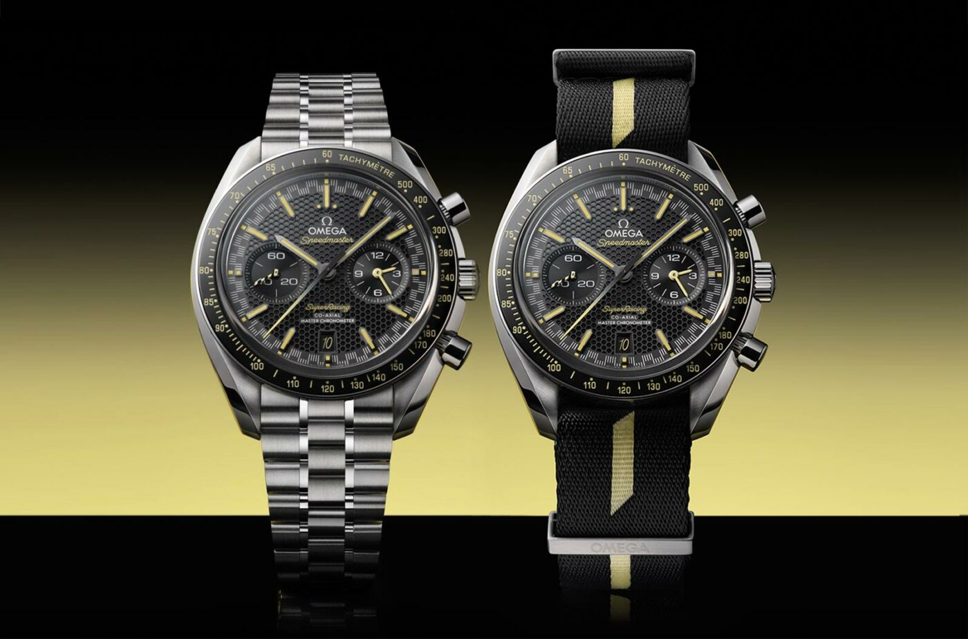 Omega Speedmaster Super Racing Co‑Axial Master Chronometer Chronograph (Ref. 329.30.44.51.01.003) comes on a steel bracelet with a foldover butterfly clasp and comfort setting as a NATO strap in recycled nylon with black and yellow stripes. MSRP is EUR 12,700.