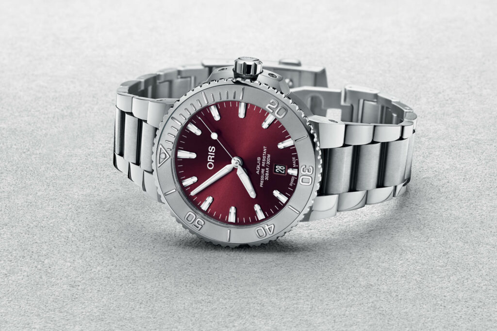 The new Oris Aquis Cherry comes attached to a solid stainless-steel bracelet and retails for $2,300.