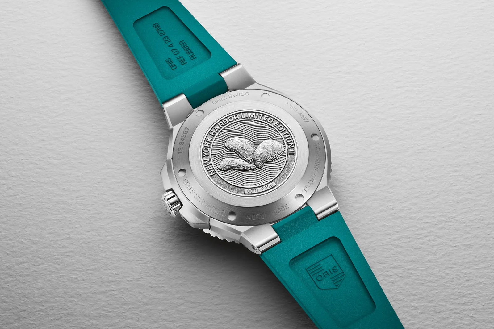 Inside the watch is the calibre 733, which began life as a Sellita SW200-1. It has a power reserve of around 40 hours and a 4Hz beat rate. Unlike a lot of Oris’ watches, which have their famous red-painted winding rotor visible through the caseback, the new Aquis Date New York Harbour Limited Edition II features a closed caseback. Instead of the rotor, you get to see a representation of the thankful oysters you’re helping to conserve by purchasing the watch.