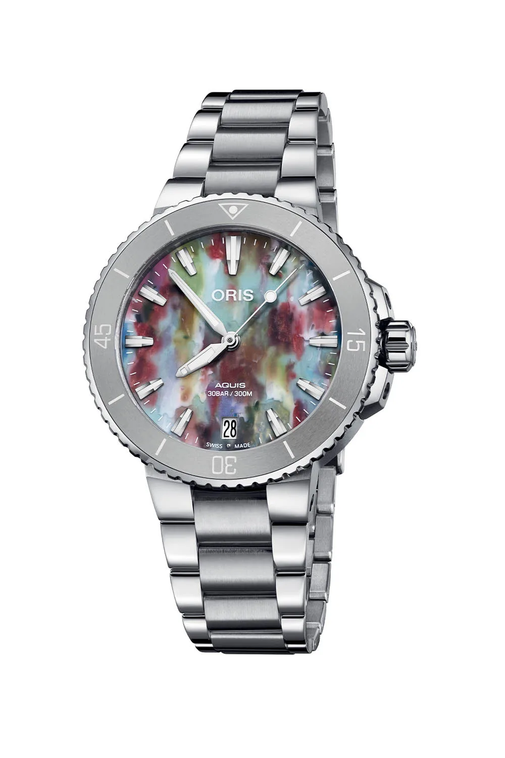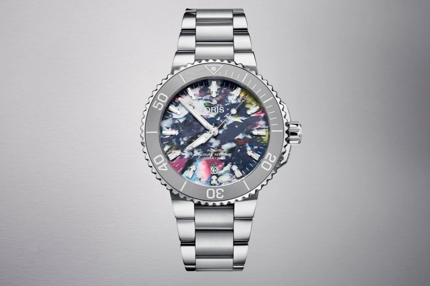 Its new watches capitalise on this. They’re based on the standard Aquis Date watch but have dials made from bits of ocean plastic that have been mulched, treated, and then fashioned into watch dials. Therefore, each one is unique to the watch, as it’s impossible to control the randomness of the fibres. It’s not the most extreme solution to the problem of ocean plastics, though. Both Alpina and Ulysse Nardin have started producing entire watches from recovered ocean plastics, whereas the case and bracelets are conventional stainless steel in Oris’ case, but it’s a step in the right direction. You do get a choice, though, of either 36.5mm or 41.5mm.