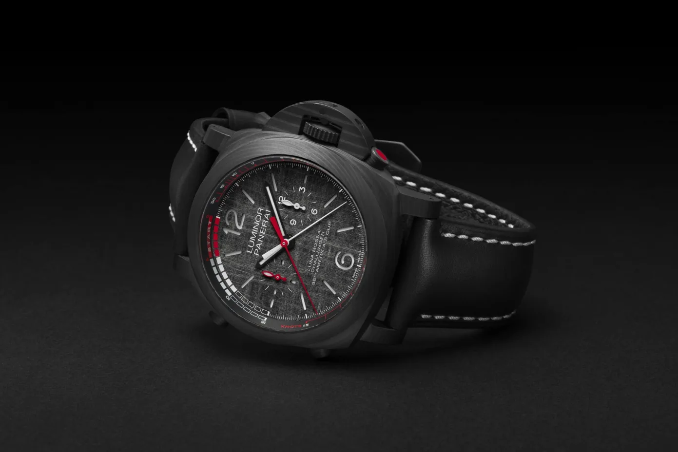 Finally, we get to the big boy, the Luminor Luna Rossa Regatta PAM01038 watch, which is even bigger and more mental than the chronograph. This monster goes all-out on both the inside and the outside, with a case made of Panerai’s signature material: Carbotech. Due to the way Carbotech is made, by pressing carbon sheets together and then subjecting them to heat and pressure, no two Carbotech cases are ever alike. The case of this one is 47mm in diameter and 19.94mm thick, I got to try the steel version of this on when I went around the Panerai factory, and the size was overwhelming, obviously designed to be worn over waterproofs. Inside the monster case is the P.9100/R calibre, an extension of Panerai’s P.9100 calibre. Using the pusher at 4 O’clock, you can push the minute hand back until you reach the required start time (sailing yachts don’t exactly start like Usain Bolt), then you use the pusher at 10 O’clock to activate the chronograph. Complicated and a little confusing to the uninitiated, but so cool.