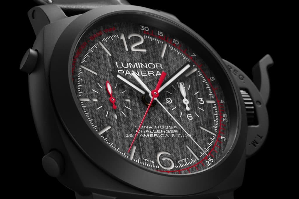 Finally, we get to the big boy, the Luminor Luna Rossa Regatta PAM01038 watch, which is even bigger and more mental than the chronograph. This monster goes all-out on both the inside and the outside, with a case made of Panerai’s signature material: Carbotech. Due to the way Carbotech is made, by pressing carbon sheets together and then subjecting them to heat and pressure, no two Carbotech cases are ever alike. The case of this one is 47mm in diameter and 19.94mm thick, I got to try the steel version of this on when I went around the Panerai factory, and the size was overwhelming, obviously designed to be worn over waterproofs. Inside the monster case is the P.9100/R calibre, an extension of Panerai’s P.9100 calibre. Using the pusher at 4 O’clock, you can push the minute hand back until you reach the required start time (sailing yachts don’t exactly start like Usain Bolt), then you use the pusher at 10 O’clock to activate the chronograph. Complicated and a little confusing to the uninitiated, but so cool.