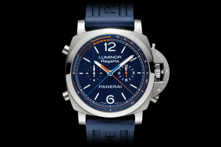 The dial on this watch has a classic Panerai style sandwich construction offering a combination of a base luminous layer followed by a top layer featuring the cutouts for hours and seconds. The primary color scheme of the dial is a deep shade of blue which really matches the nautical spirit of the watch. Further to that, there are some nice white, orange and light blue accents that really liven up the dial. The hour markers are a mix of cut-out curved rectangular indices and Arabic numerals, and the running seconds are presented through a sub-dial at 9. But, the most interesting and defining feature of this watch is the Regatta function and here’s how it works. Pressing the pusher at 4 activates the orange chronograph hand which is meant to move back 1 minute at a time along the countdown scale marked between 9 and 12, with the vital five minutes marked highlighted using the word START printed above. The fly-back chronograph pusher at 10 begins the countdown by initiating the blue chronograph hand and once the countdown is complete with the orange hand touching 0, one can continue tracking the elapsed time from the start of the race.