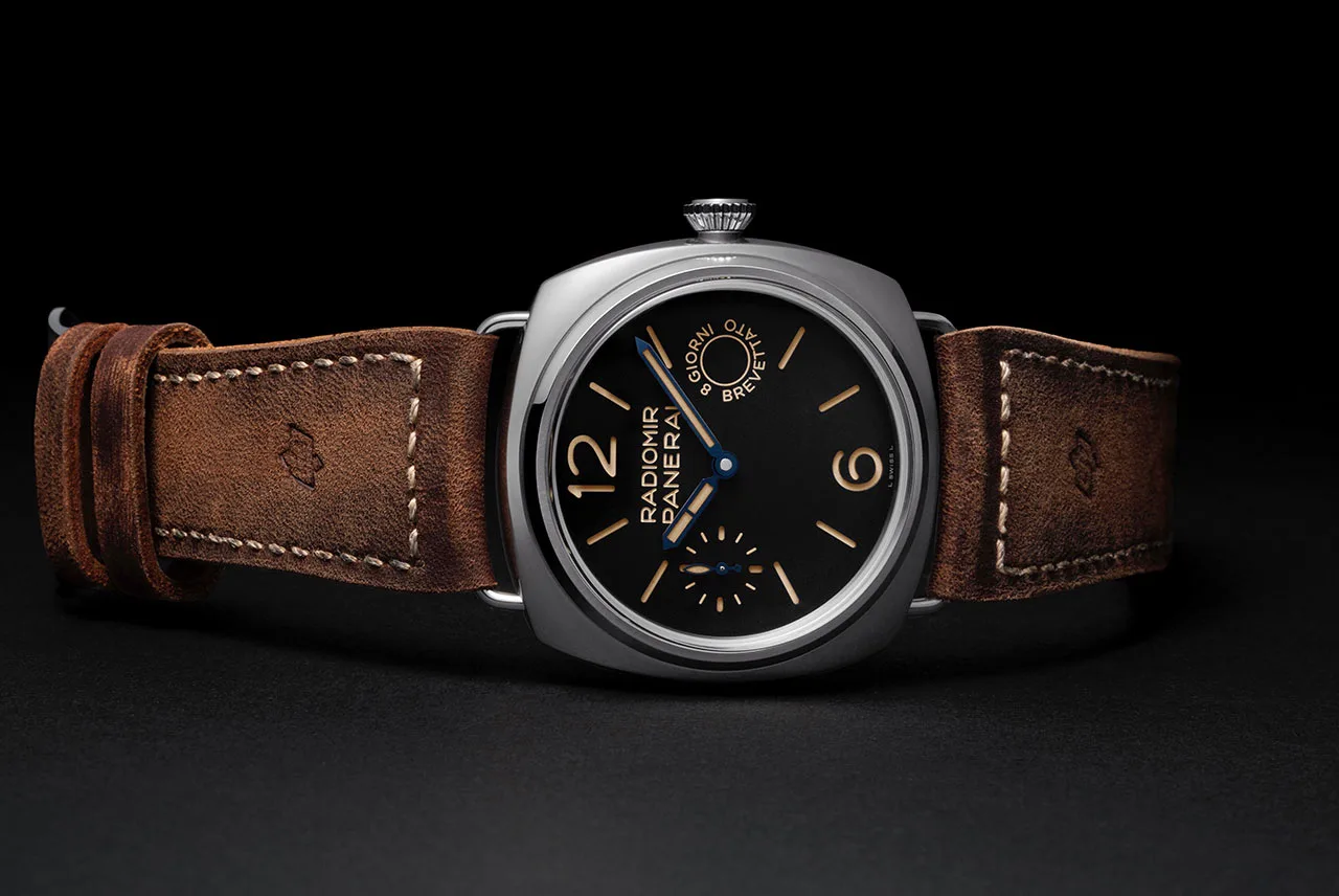Presented in black with a nice Matt finish, the dial has a familiar Panerai aesthetic. It features a sandwich-style construction with batons and bold Arabic numerals at 12 and 6 that have been cut out to expose a layer of superluminova sitting beneath. This gives the dial a sense of depth and helps emit a strong and long-lasting glow making it easy to read the time in dimly lit situations. At 9 o’clock is a subsidiary seconds register, and in a thoughtful move to maintain the symmetry and balance of the dial, at 3 is the text “8 GIORNI BREVETTATO” that indicates the 8-day power reserve this watch offers. One of my favorite detail on this dial are the thermally blued hands that add a nice pop of the color to the watch and akin to the overall lume application have been filled with custard colored luminous paint to evoke a vintage vibe.