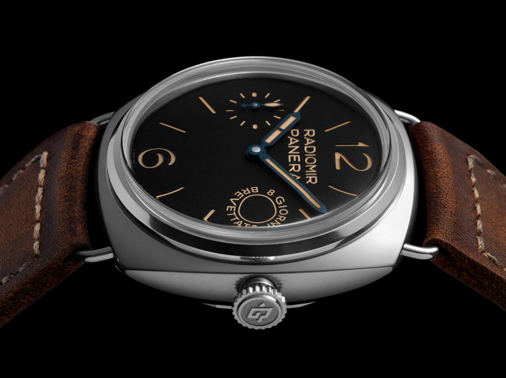 Presented in black with a nice Matt finish, the dial has a familiar Panerai aesthetic. It features a sandwich-style construction with batons and bold Arabic numerals at 12 and 6 that have been cut out to expose a layer of superluminova sitting beneath. This gives the dial a sense of depth and helps emit a strong and long-lasting glow making it easy to read the time in dimly lit situations. At 9 o’clock is a subsidiary seconds register, and in a thoughtful move to maintain the symmetry and balance of the dial, at 3 is the text “8 GIORNI BREVETTATO” that indicates the 8-day power reserve this watch offers. One of my favorite detail on this dial are the thermally blued hands that add a nice pop of the color to the watch and akin to the overall lume application have been filled with custard colored luminous paint to evoke a vintage vibe.