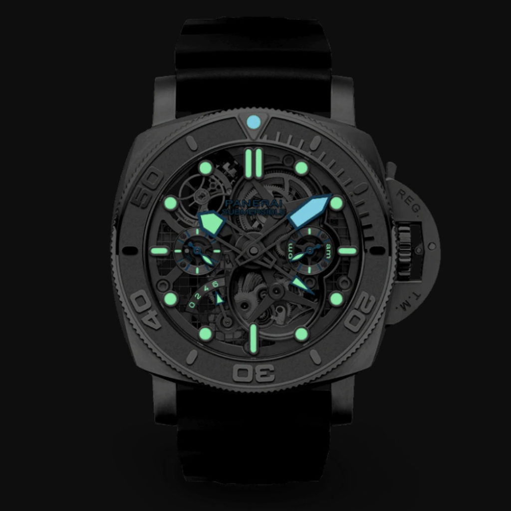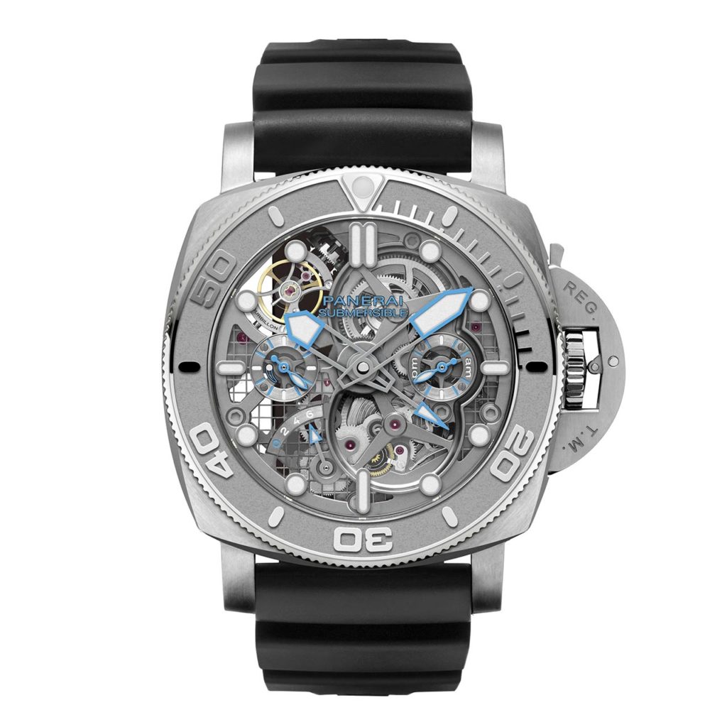 That’s right, Panerai is only making five of these bad boys, and for a good reason. The movement in this particular Submersible isn’t like the rest. It’s been skeletonised, the parts that cover the inner workings of the watch have been stripped away, so the mechanics are laid bare. The vertically rotating tourbillon is a particular delight, rather than spinning on the same axis as the rest of the movement, this one rotates at a 90-degree angle. Supposedly, this solves the problem that regular tourbillons have, which is that their design was made for pocket watches that stay vertical all the time.