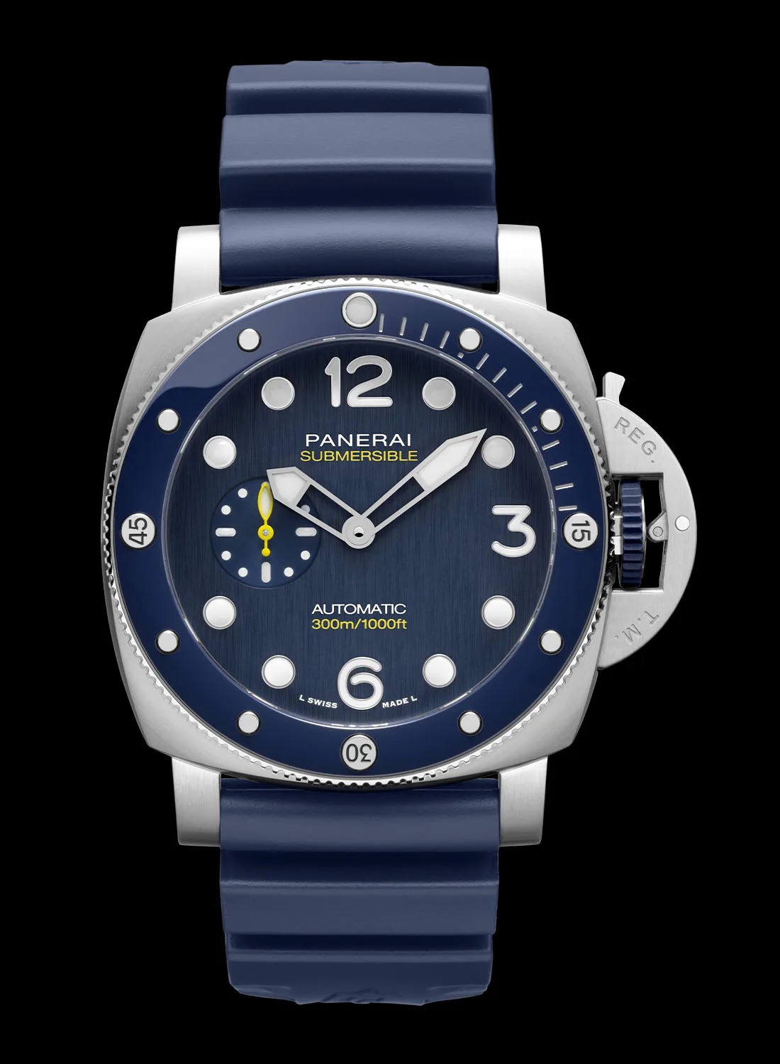 The vertically brushed blue dial features oversized applied hour markers that are 20% larger than those on standard Submersible models for superior legibility in low-light conditions. The hands and markers are filled with white Super-LumiNova X1 for some necessary brightness underwater. Yellow accents lend the dial a vibrant contrast, appearing on the small seconds hand, the depth rating and the Panerai logo. The absence of a date window keeps the design clean, while Arabic numerals at 3, 6, and 12 o’clock convey the sporty, purposeful look.