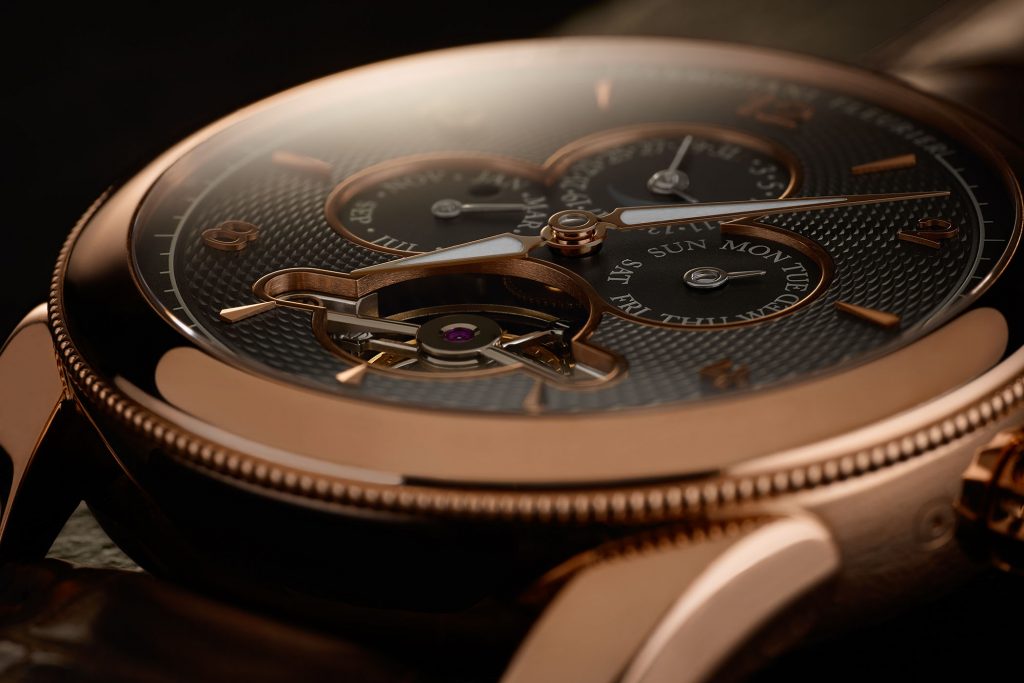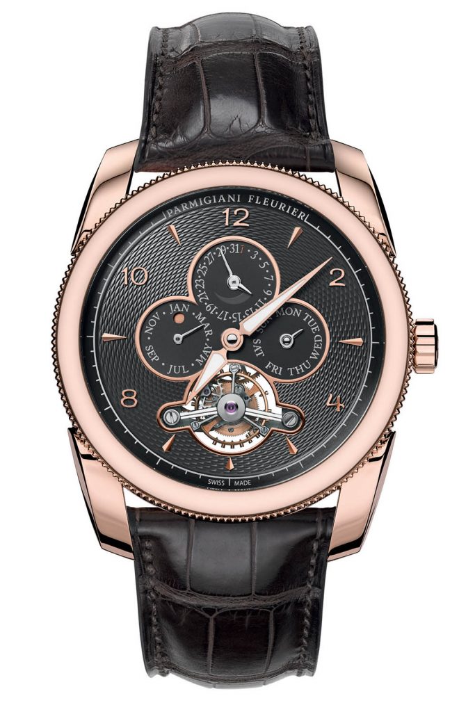 The dial on the Tecnica Ombre Noire is stunningly ornate thanks to the intricate guilloche work. The ‘grain de riz’ pattern is executed totally by hand and gives the dial a distinctive visual appeal. The hour markers are a mix of Arabic numerals and triangular faceted markers and have been applied to give a nice sense of depth to the dial. Further to that taking center stage are 4 closely arranged circular sub-dials which display the array of complication this watch has to offer. At 12, 3 and 9 are the perpetual calendar indications for the date, day of the week and the month respectively. Placed just above 6 is the heart of the watch, the one-minute tourbillon. And while there is so much on offer on this dial Parmigiani has done a great job of keeping things clean and legible.