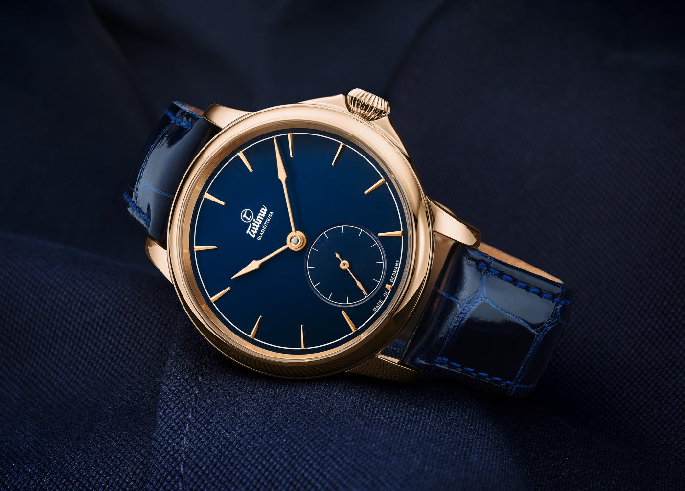 Tutima Glashütte Patria Ref. no. 6600-03 comes on a blue alligator leather strap with an 18-karat rose gold pin buckle, further harmonizing the consistency of the blue-and-gold color scheme. The watch retails for $21,000.